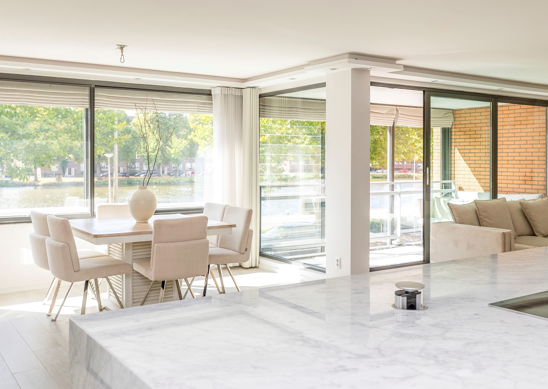 Vanuit de woonkamer stapt u zo het balkon/serre op, dat dankzij de glazen schuifwanden volledig af te sluiten is. Hierdoor geniet u hier het hele jaar door van een heerlijke extra leefruimte, met uitzicht op het water.