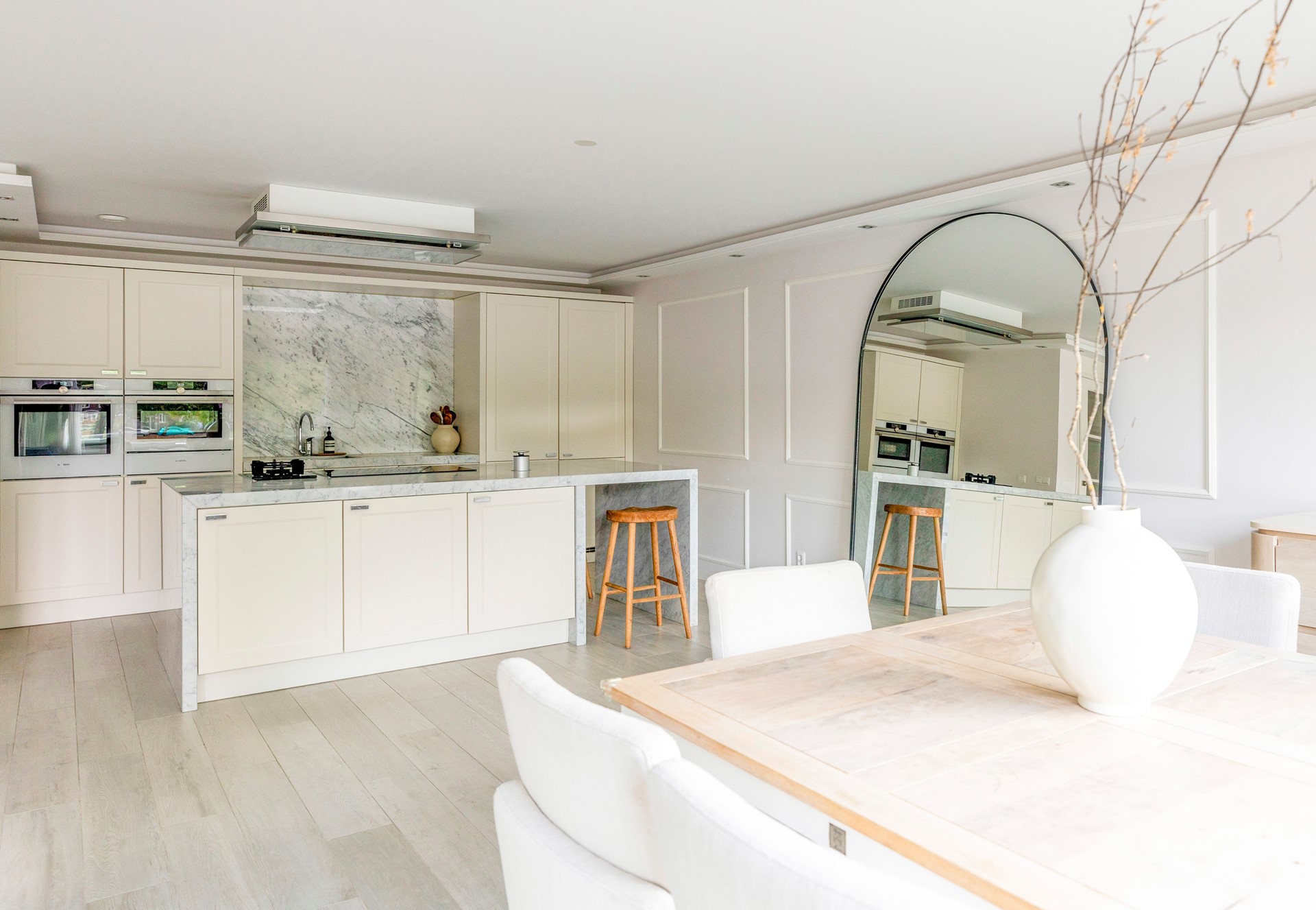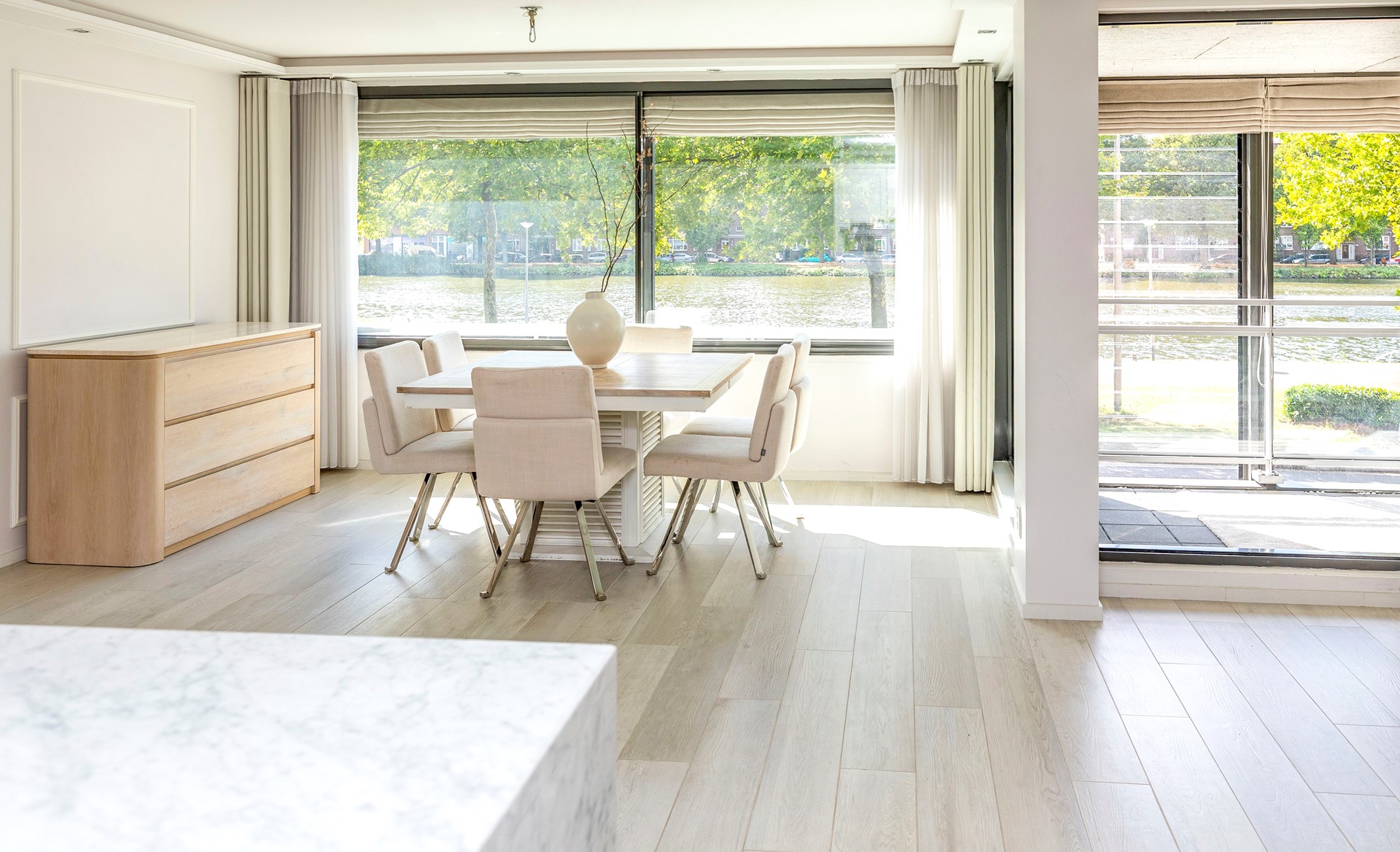 De woonkamer strekt zich uit over de volle breedte van de woning en is prachtig afgewerkt met sierlijsten, strak stucwerk en een fraaie vloer. Dankzij de grote raampartijen is het hier heerlijk licht. De luxe open keuken vormt het hart van de ruimte en nodigt uit tot gezellig koken en samenzijn.