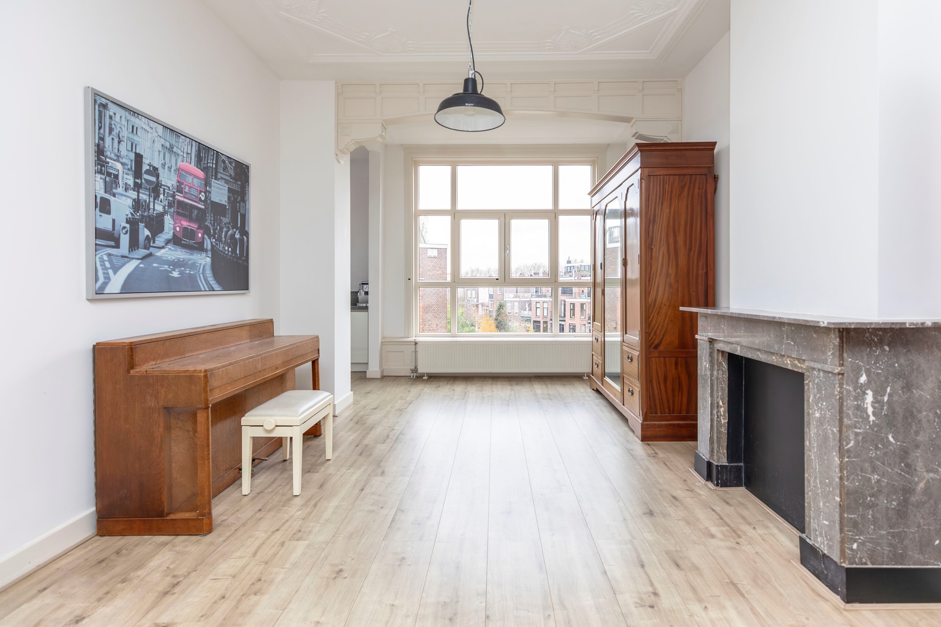 Wat direct opvalt in de woonkamer is de overvloed aan licht dankzij de grote raampartijen aan zowel de voor- als achterzijde. De sierlijke plafondlijsten en de originele marmeren schouw geven de ruimte extra karakter en een warme, klassieke uitstraling. Waar de woonkamer vroeger was opgedeeld in een voor-, tussen- en achterkamer, is het nu één royale leefruimte met een open, ruimtelijk gevoel.