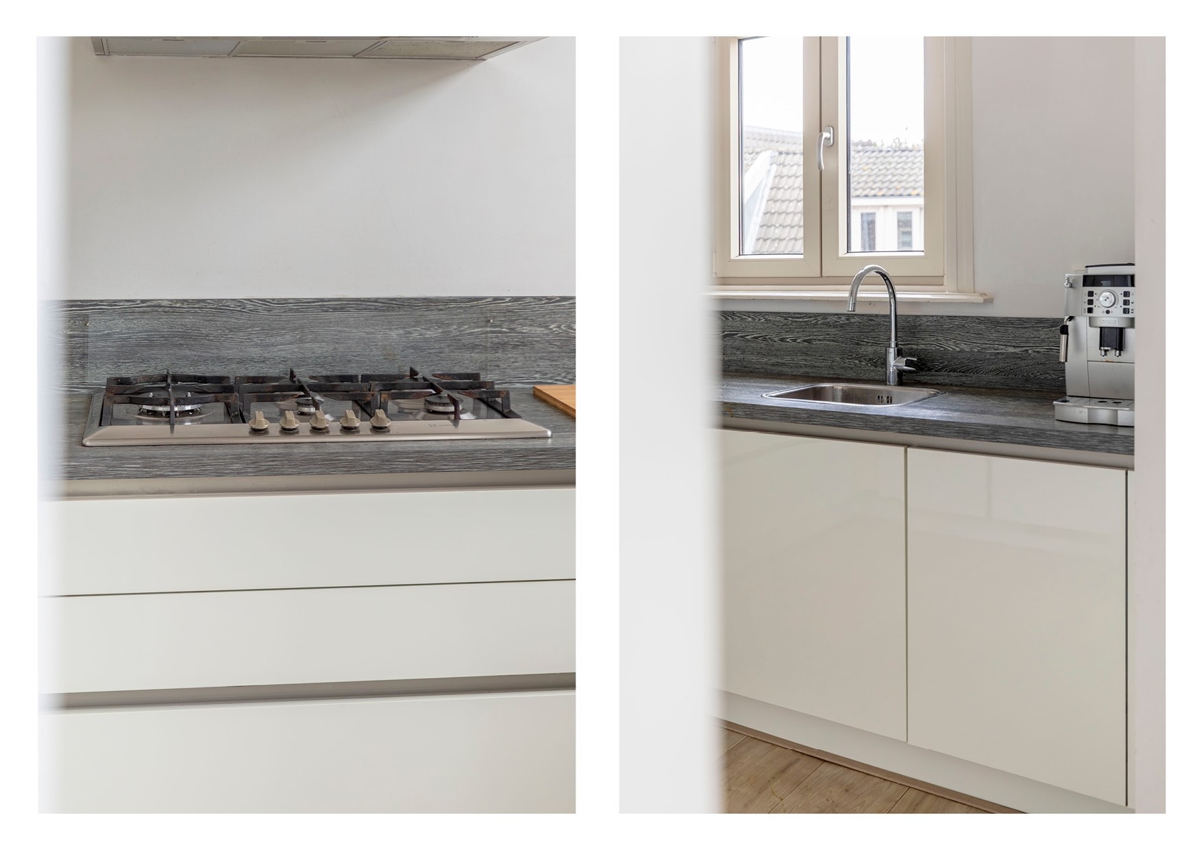 Aan de achterzijde bevindt zich de halfopen keuken, uitgevoerd in tijdloos wit met een houtlook aanrechtblad. De keuken is compleet met diverse inbouwapparatuur, waaronder een 5-pitsgaskookplaat met RVS-afzuigkap, vaatwasser, combi oven/magnetron en koelkast. Vanuit hier kijk je leuk uit over de binnentuinen aan de achterzijde van de woning.