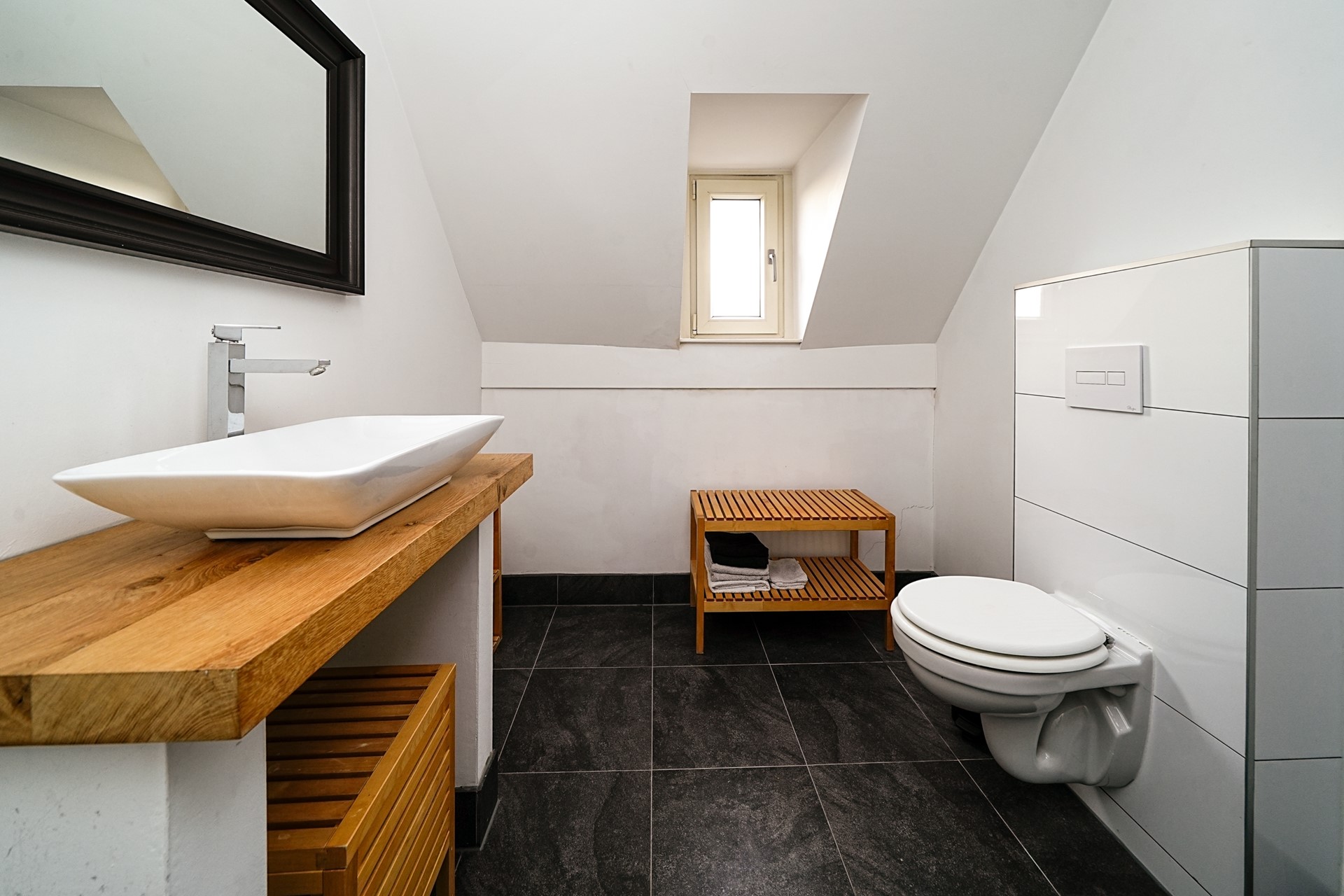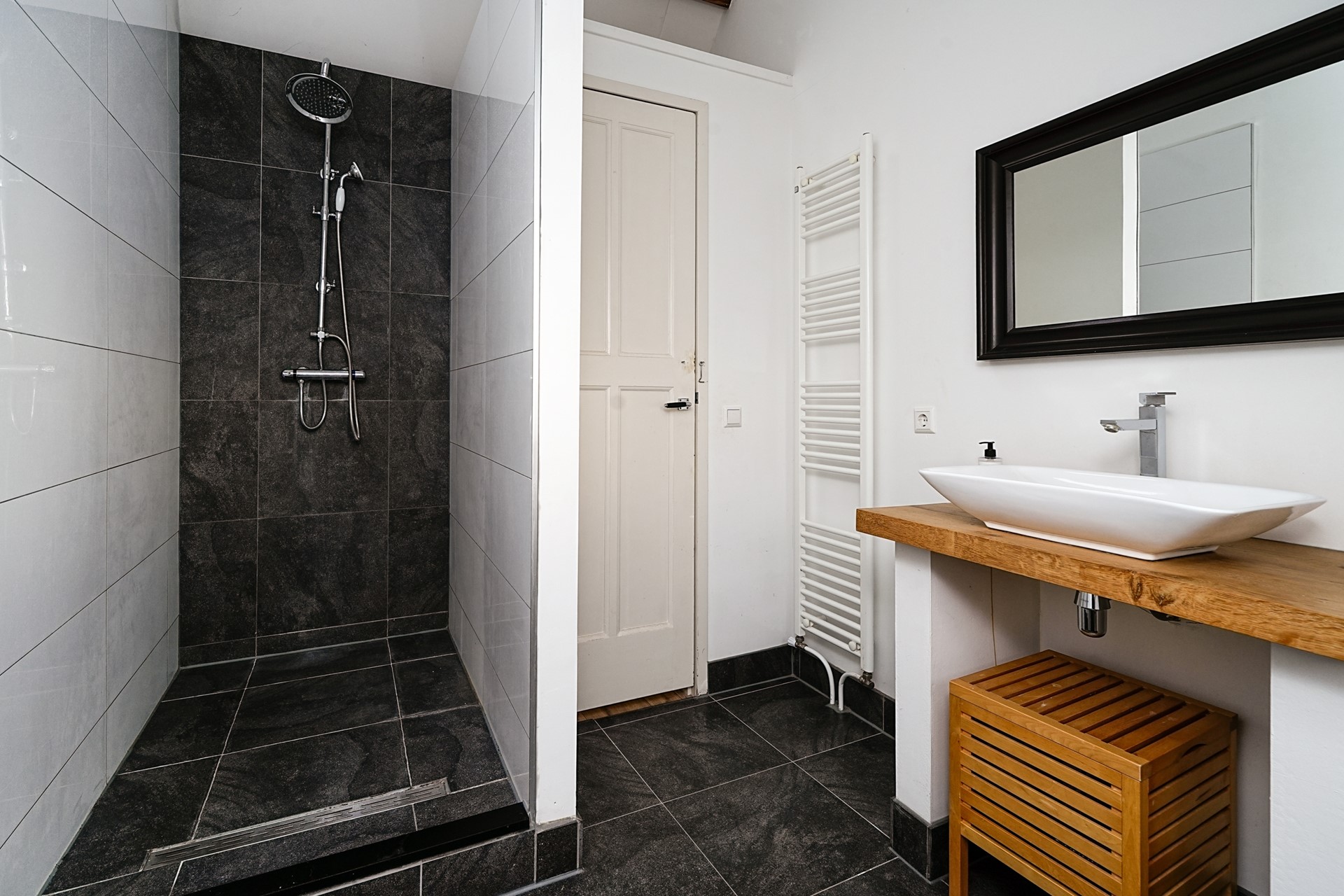 De badkamer is modern uitgevoerd met een inloopdouche voorzien van regendouche en handdouche, een hangend toilet en een wastafelmeubel. De wanden en vloeren zijn strak afgewerkt met een combinatie van stuc- en tegelwerk.