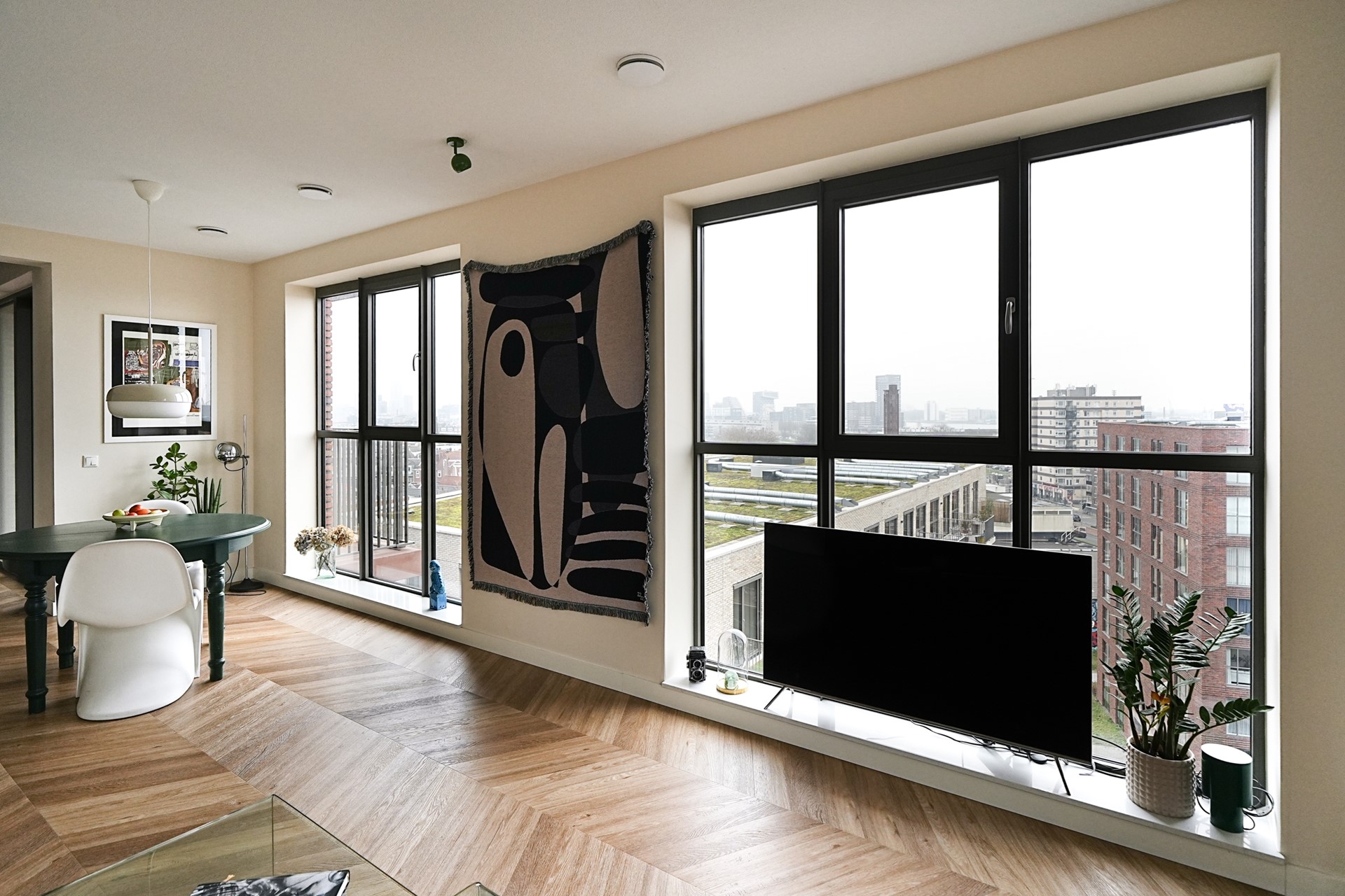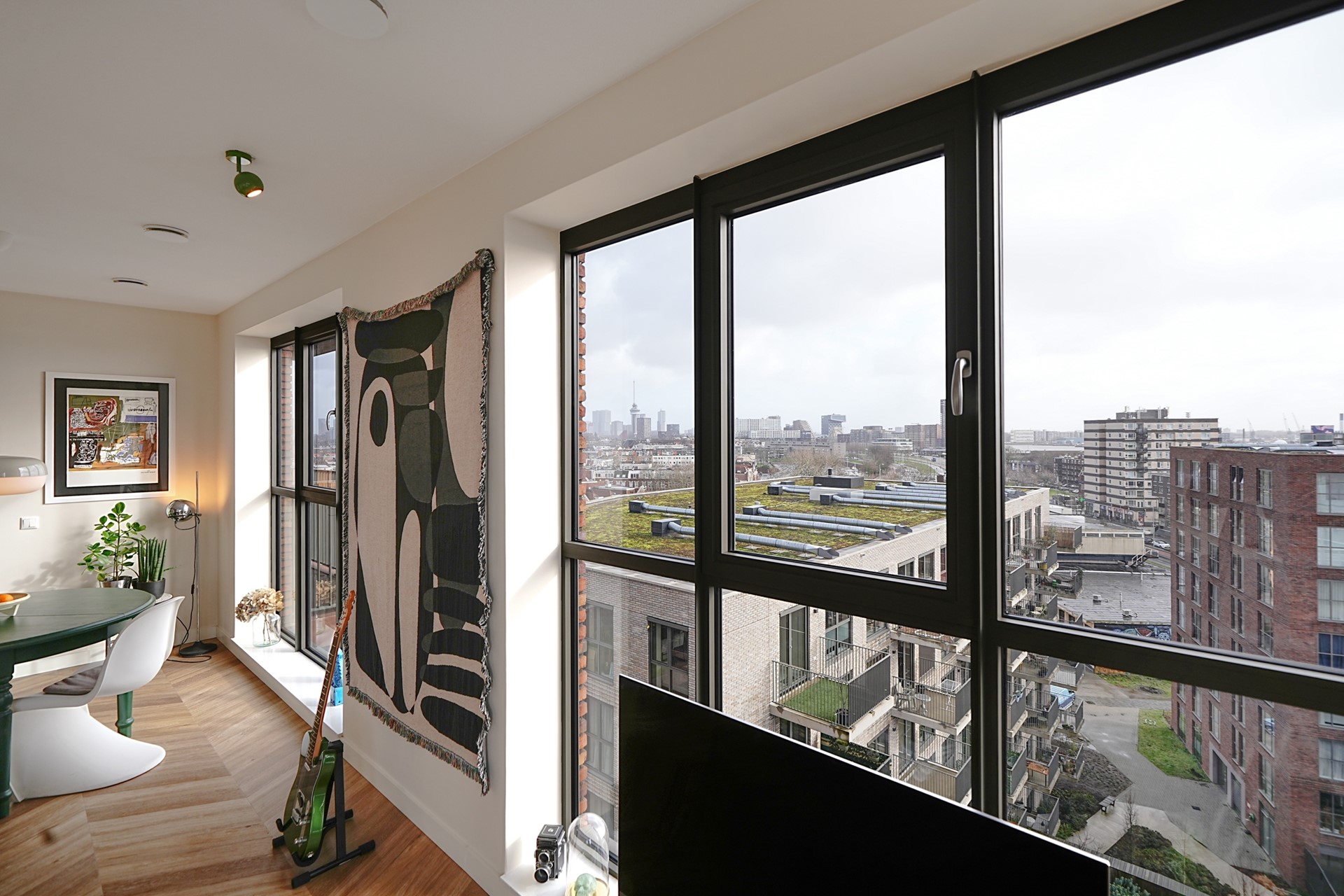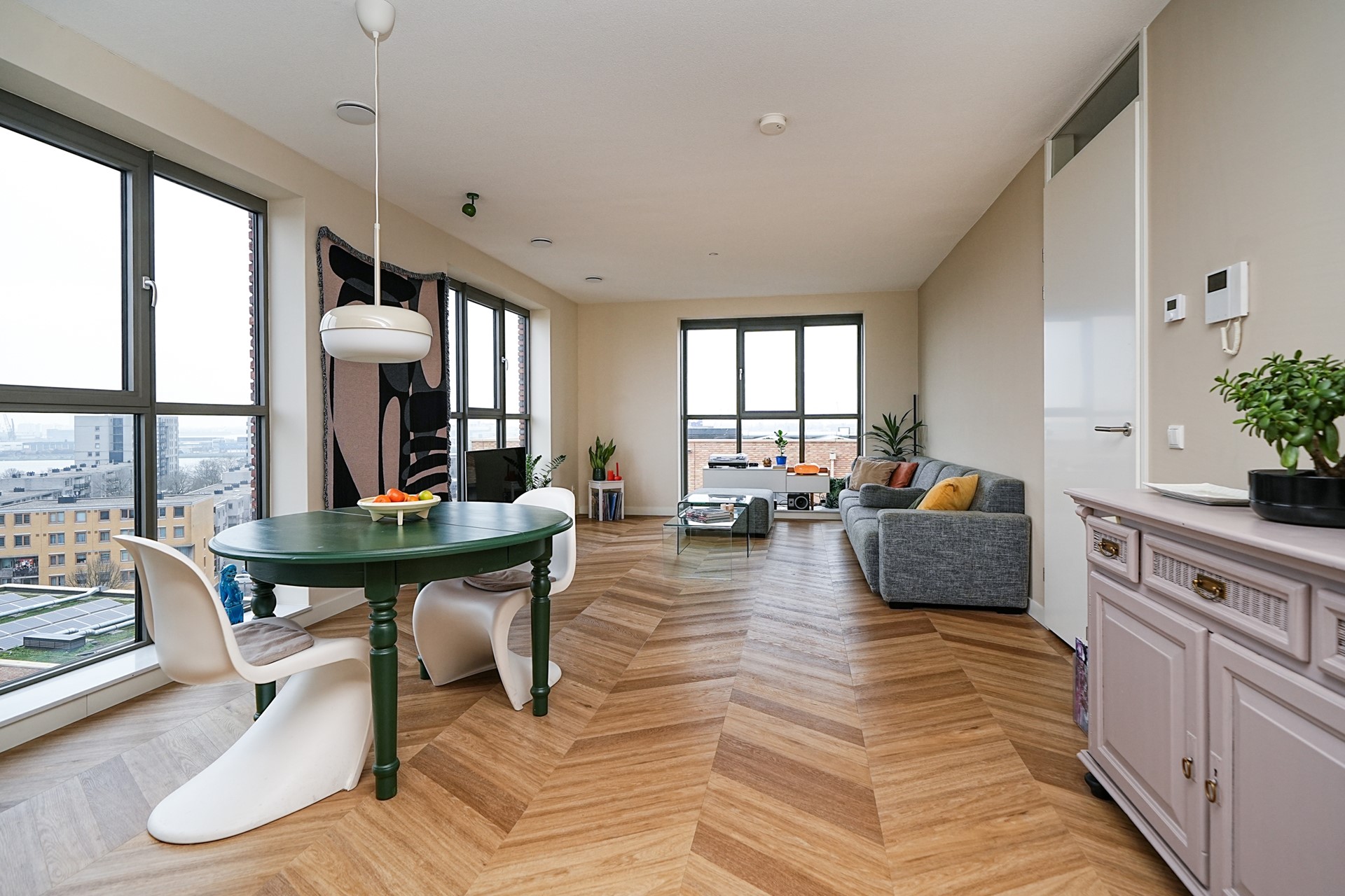 De riante woonkamer is een absolute eyecatcher. Dankzij de grote raampartijen, vrijwel van vloer tot plafond, en de hoekligging geniet u hier van een schitterend uitzicht aan meerdere zijden, met als hoogtepunt het panoramische zicht over de Maas en de havens van Rotterdam. De fraaie PVC-vloer, gelegd in Hongaarse punt, beschikt over vloerverwarming en geeft de ruimte een warme en luxe sfeer. Wanden en plafond zijn strak afgewerkt en de indeling biedt volop ruimte voor zowel een gezellige zithoek als een aparte eethoek.