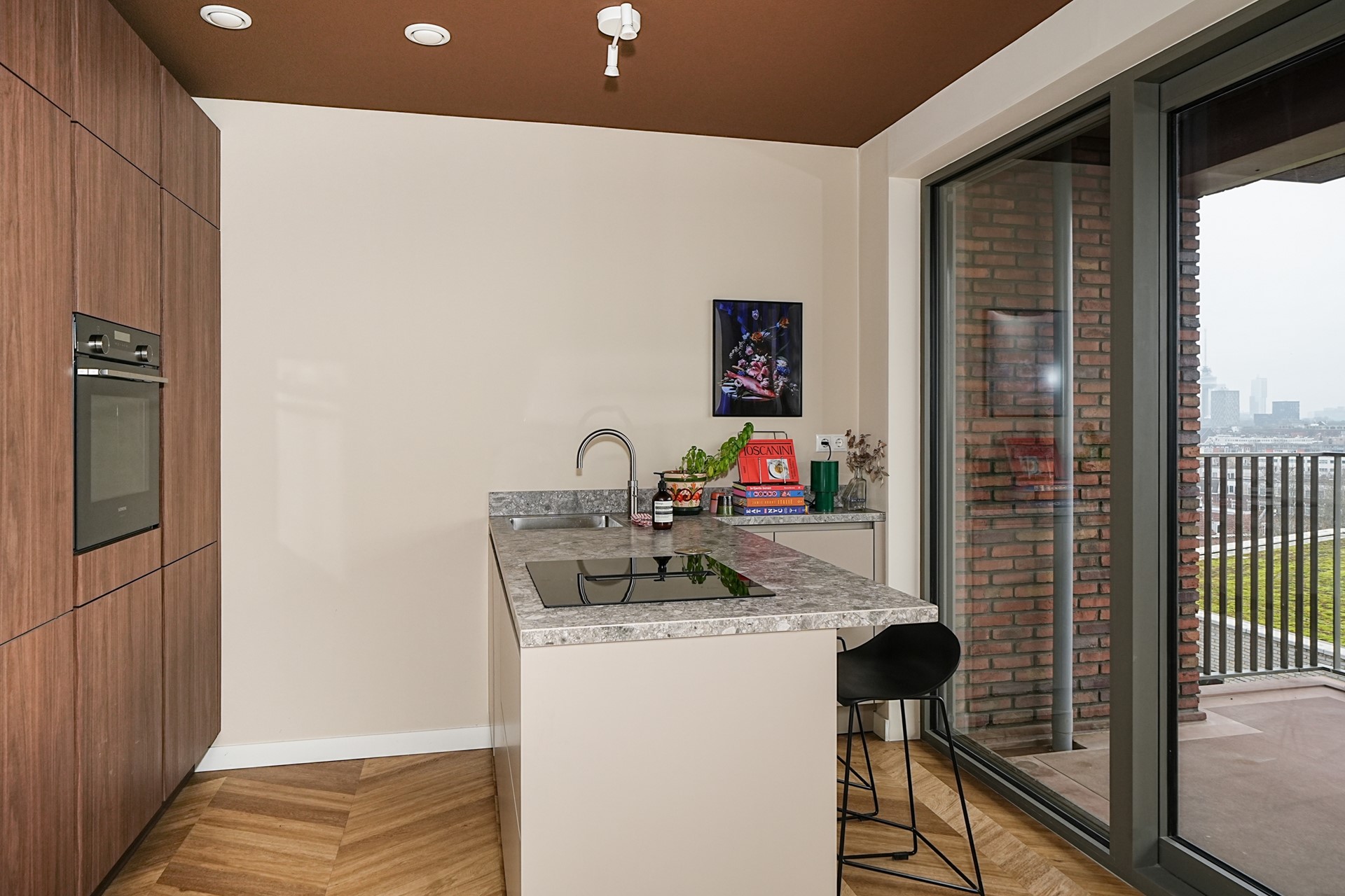 Via een luxe schuifpui bereikt u de loggia / het balkon op het zuidoosten. Dankzij deze ideale zonligging is het hier heerlijk genieten van de zon. Er is voldoende ruimte voor een comfortabele loungebank of een eettafel, terwijl u uitkijkt over het weidse uitzicht. Een perfecte plek om de dag te beginnen met koffie of af te sluiten met een goed glas wijn.