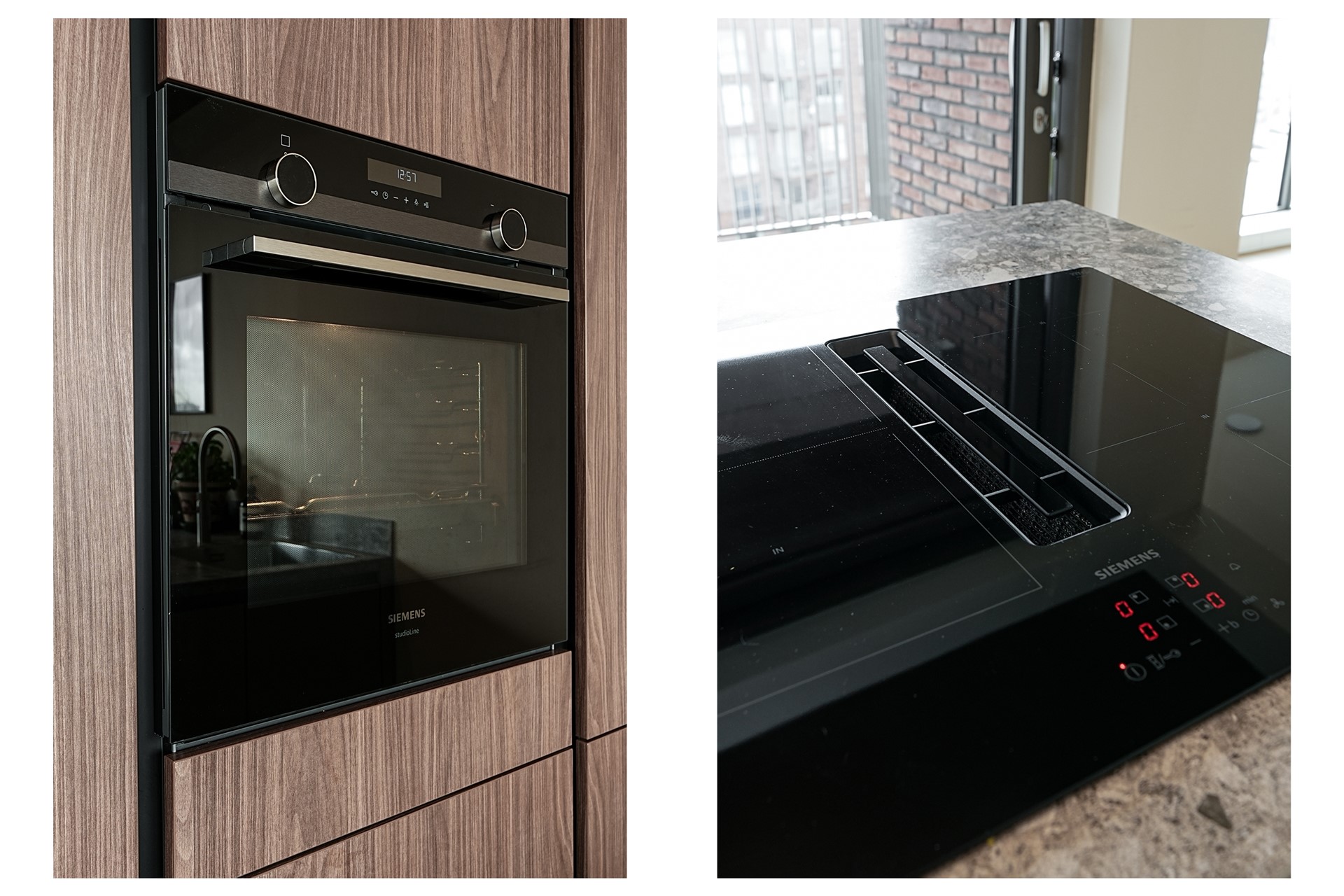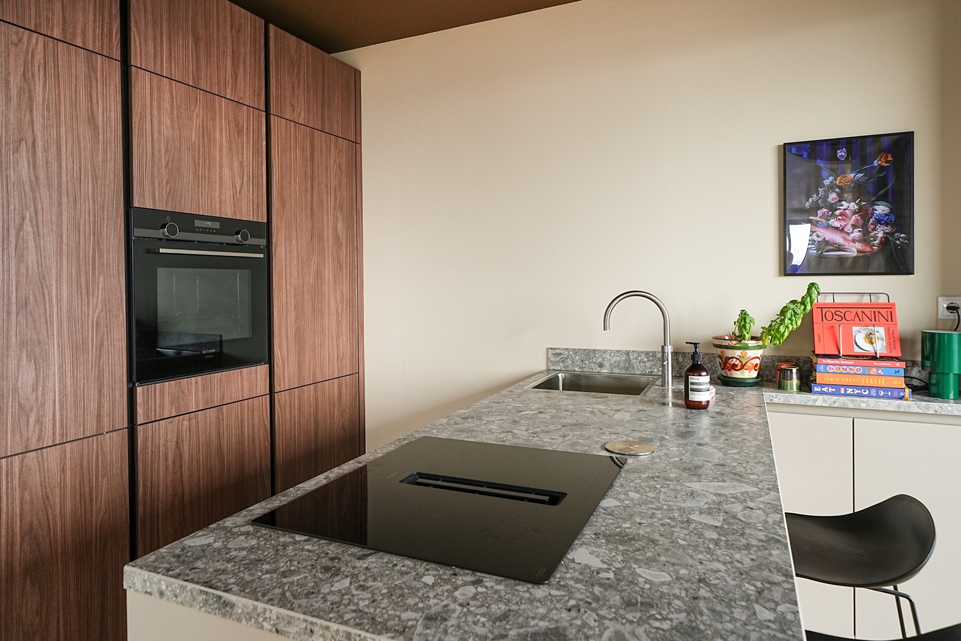 De open keuken is werkelijk een plaatje. Deze is uitgevoerd met een stijlvol wandmeubel met houtlook kasten en een kookeiland in L-vorm met een prachtig natuursteen-look werkblad. De keuken is van alle moderne gemakken voorzien, waaronder een inductiekookplaat met geïntegreerde afzuiging, koelkast, vriezer, vaatwasser, inbouwoven én een luxe heetwaterkraan (Quooker) voor direct kokend water. Daarnaast is er veel praktische bergruimte. Vanuit de keuken is er toegang tot de bijkeuken, ideaal voor extra opslag en voorraad.
