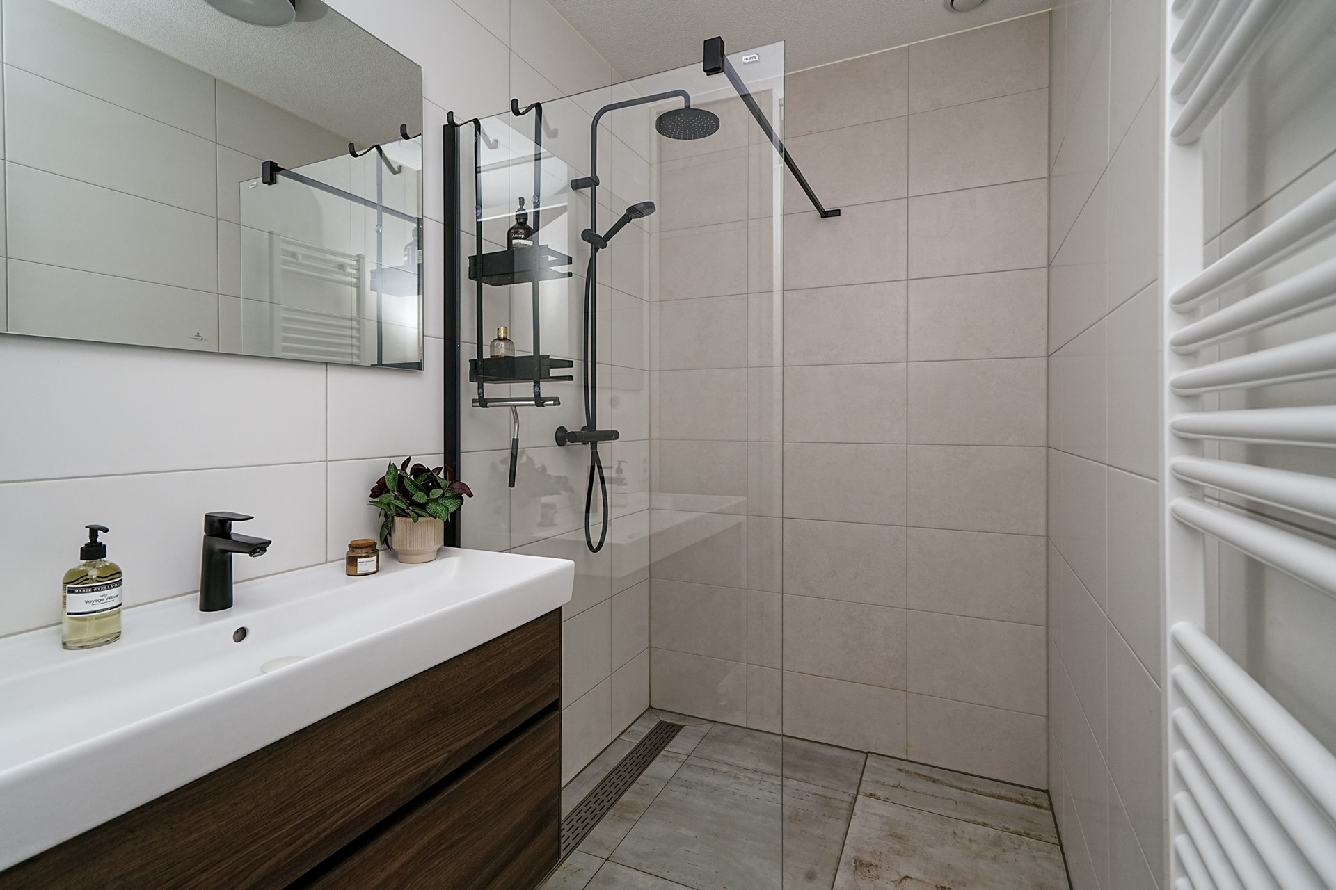 De badkamer heeft een luxe en moderne uitstraling en is afgewerkt met grote witte wandtegels en moderne vloertegels. U vindt hier een ruime inloopdouche met glazen wand, een wastafel met meubel en een grote spiegel. Het separate toilet in de hal is in dezelfde stijlvolle afwerking uitgevoerd.