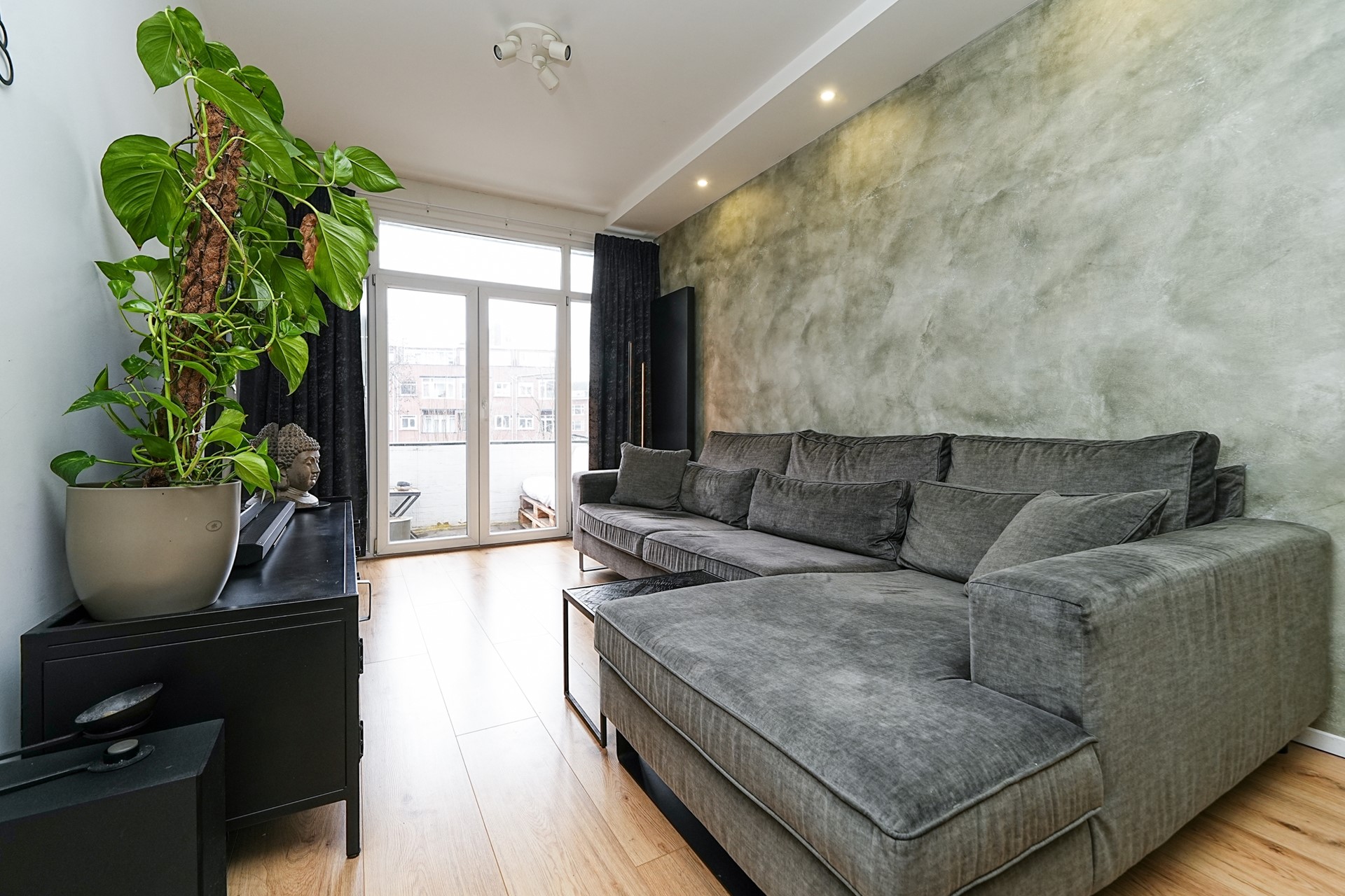 Het woongedeelte met open keuken bevindt zich aan de achterzijde van de woning. Grote raampartijen met openslaande deuren naar het balkon zorgen voor een overvloed aan daglicht. Het plafond met inbouwspots maakt het geheel helemaal af.