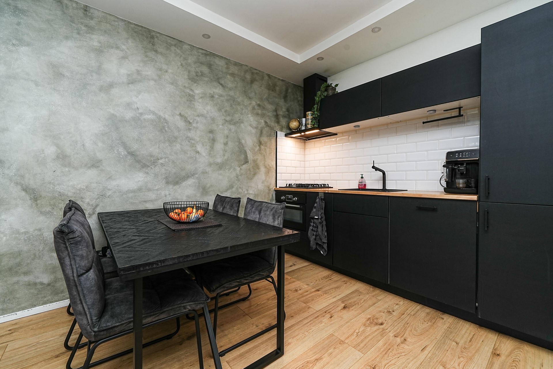 De open keuken is uitgevoerd in stijlvol zwart met een houtlook aanrechtblad, wat zorgt voor een luxe en warme uitstraling. De keuken is compleet uitgerust met een inbouwoven, 4-pits gasfornuis, afzuigkap, vaatwasser, koel-/vriescombinatie en een spoelbak met mengkraan. De zwarte kasten met bijpassende handgrepen geven de keuken een strak en modern karakter.