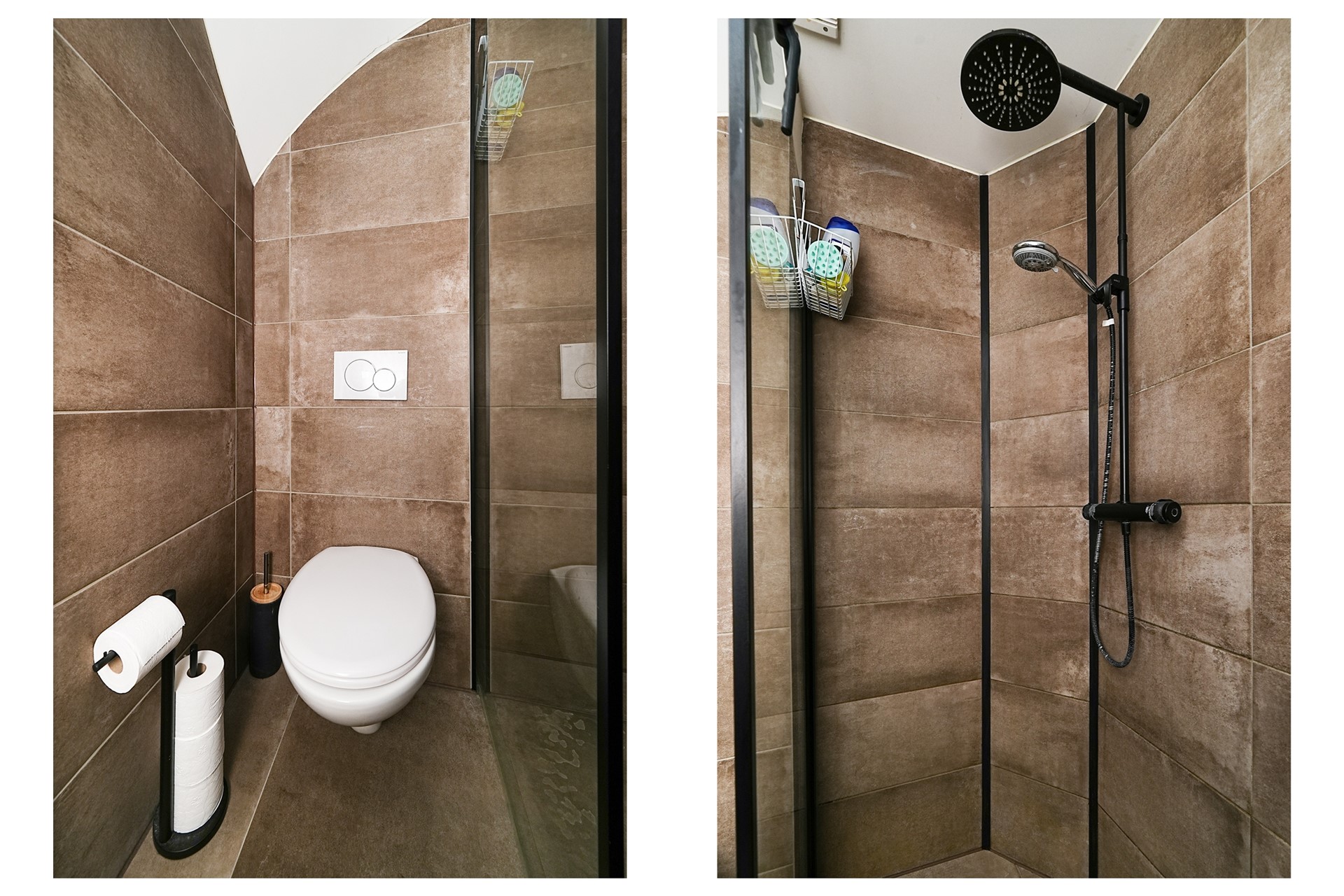Via de open hal, waar ook de meterkast is gesitueerd, bereik je de luxe badkamer. Deze is voorzien van een fijne inloopdouche met zwarte accenten en thermostaatkraan, een zwevend toilet, designradiator en een wastafelmeubel met spiegel. De bruin getinte vloer- en wandtegels geven de ruimte een warme, moderne uitstraling.