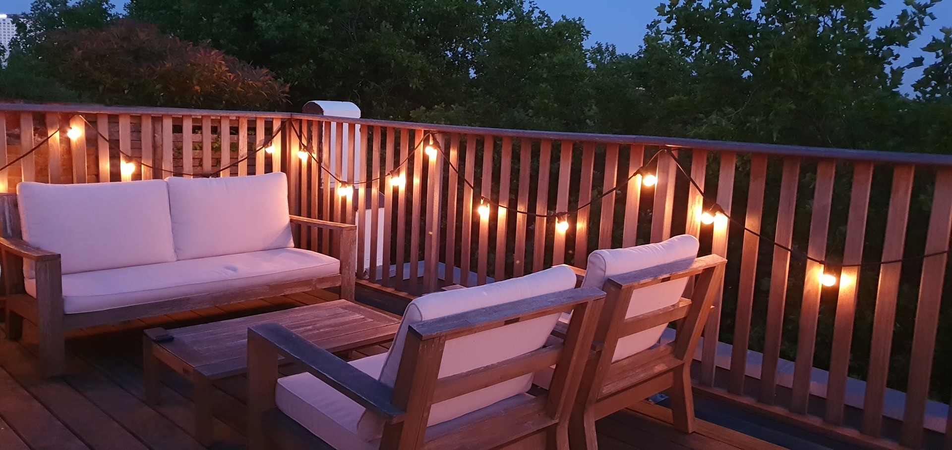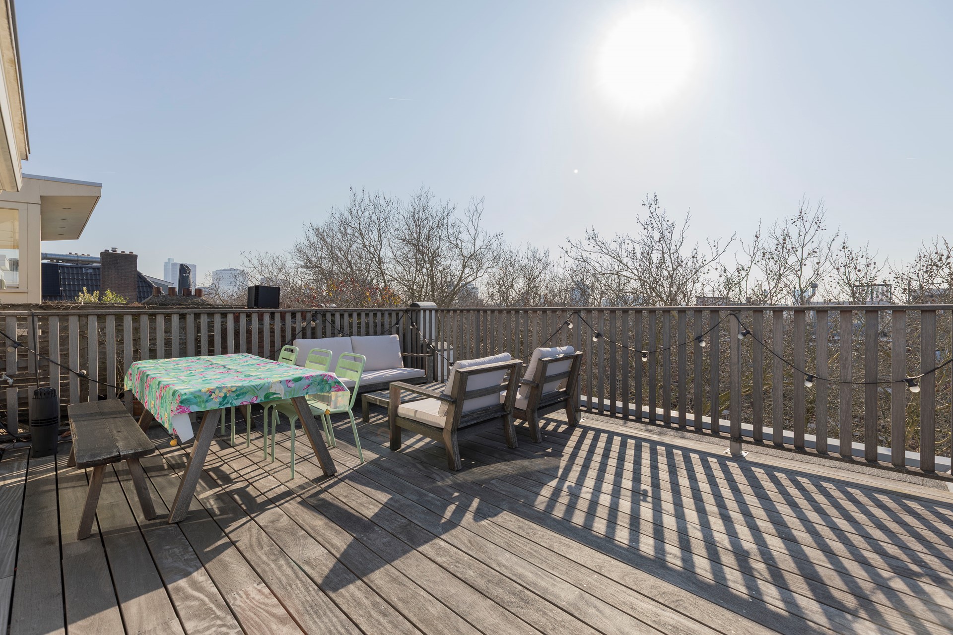 Via de schuifpui stap je zo het grote dakterras op. Dit heerlijke buitenverblijf is afgewerkt met hardhouten vlonders en een hardhouten hekwerk en biedt veel privacy. Een fantastische plek om te genieten van de zon en het uitzicht over Rotterdam.
