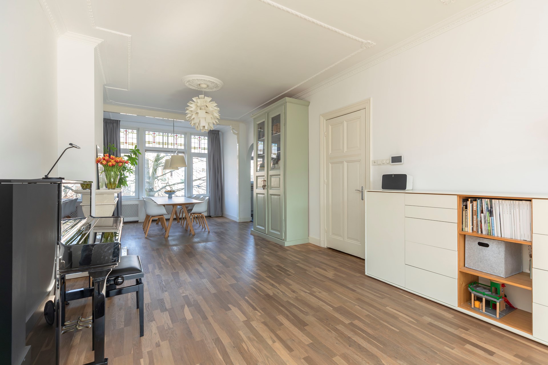 De royale doorzon woonkamer straalt karakter uit met een houten vloer, glas-in-loodbovenramen, ornamentenplafond en paneeldeuren. De schouw met gashaard vormt een sfeervol middelpunt. Aan de voorzijde openen de deuren naar een charmant Frans balkon op het zuiden, een heerlijke plek om de deuren open te zetten en te genieten van het vrije uitzicht en het groen.