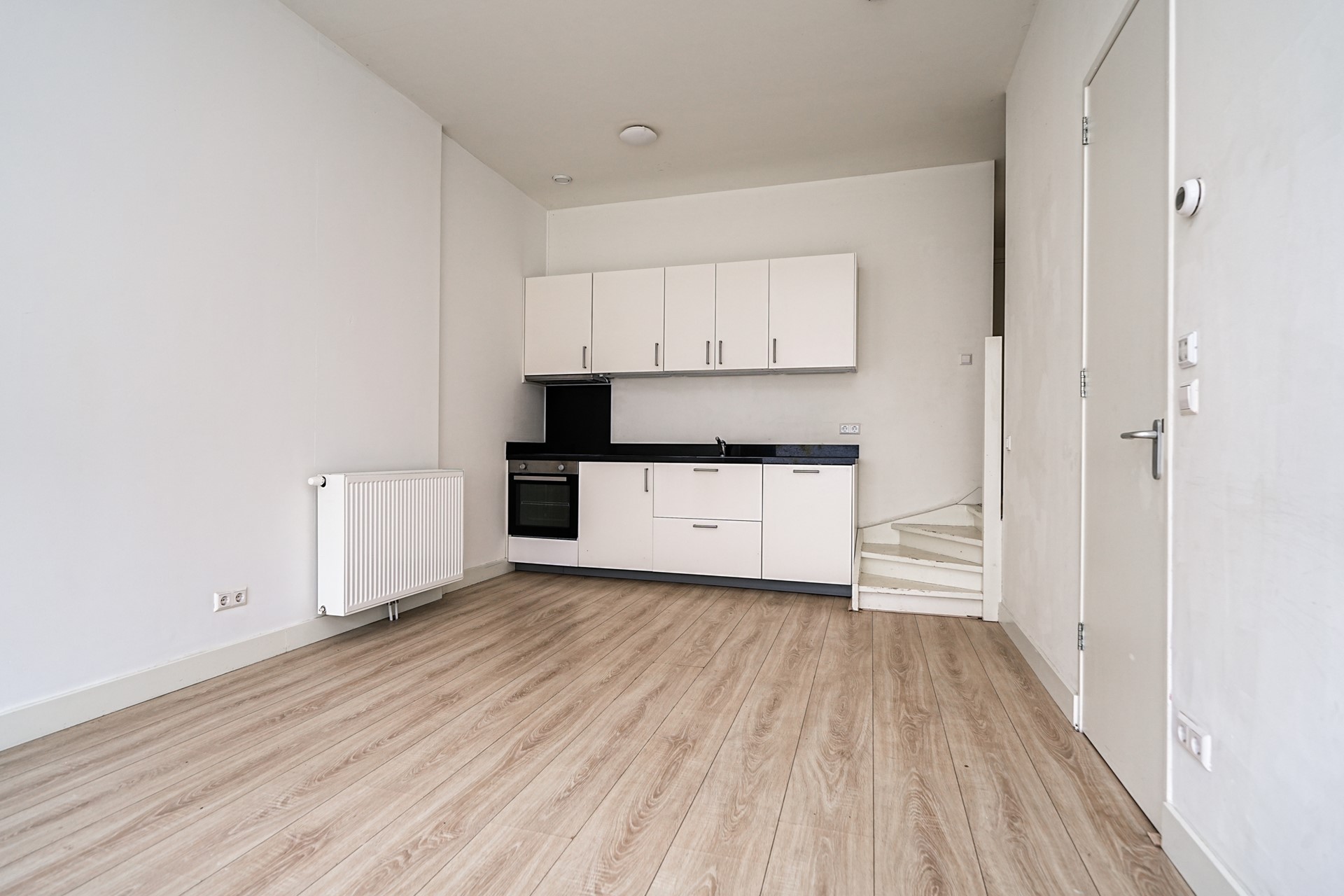 Bij binnenkomst stap je direct de sfeervolle woonkamer met open keuken binnen. Dankzij het grote etalageraam, een knipoog naar het verleden als winkelpand, profiteer je hier van een prachtige lichtinval. De ruimte is strak afgewerkt met gestuukte wanden en een lichte laminaatvloer, wat zorgt voor een frisse en moderne uitstraling.