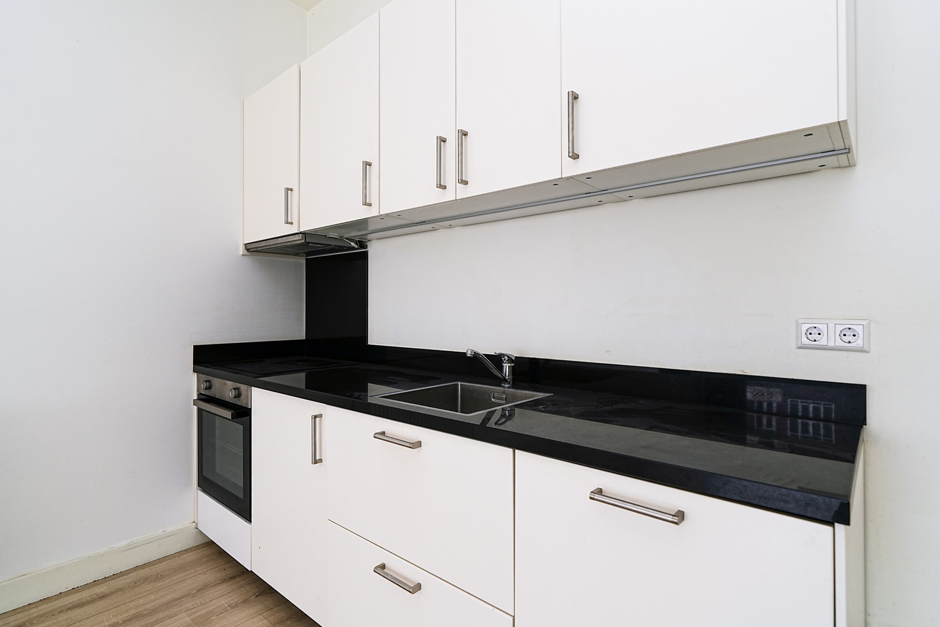 De keuken bevindt zich aan de achterzijde in de ruimte en is praktisch én stijlvol ingericht met witte kastfronten en een zwart natuurstenen werkblad. De keuken is compleet uitgerust met een spoelbak, elektrisch fornuis met afzuigkap, koelkast met vriesvak en vaatwasser. In de woonkamer vind je daarnaast een handige inbouwkast met extra opbergruimte en de cv-opstelling.
