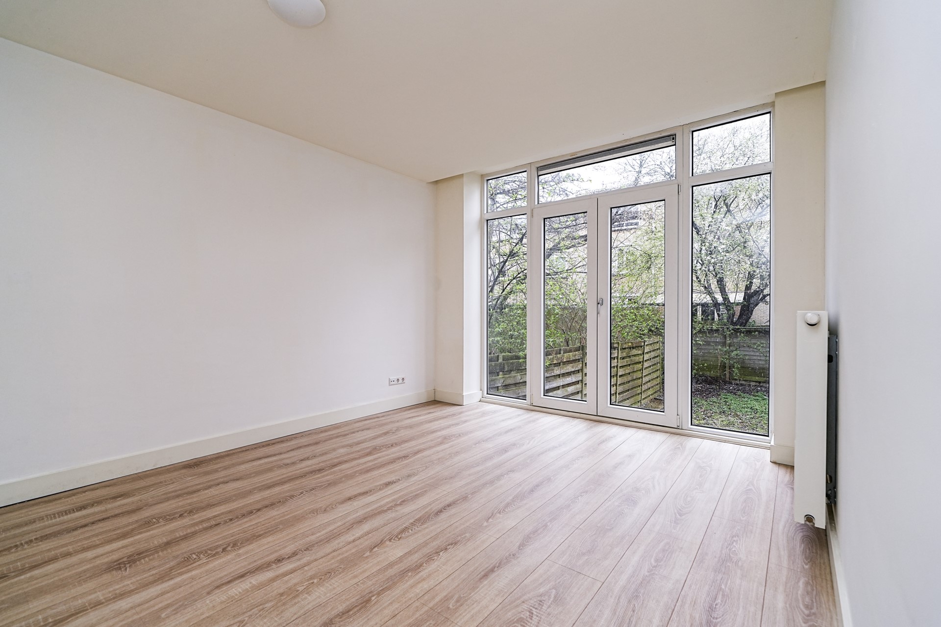 De royale slaapkamer ligt aan de rustige achterzijde van de woning en biedt volop ruimte voor een groot tweepersoonsbed en een kledingkast. Dankzij de grote raampartij en openslaande deuren geniet je hier van veel licht en direct contact met de tuin. Ook hier is alles netjes afgewerkt met strak stucwerk en een lichte laminaatvloer.