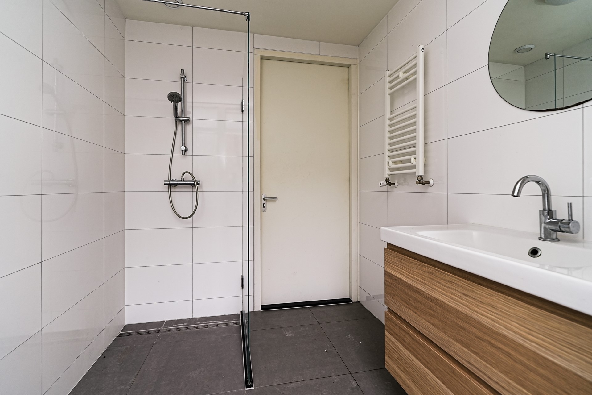 De badkamer is eveneens aan de achterzijde gelegen en modern afgewerkt met grijze vloertegels en witte wandtegels. Je vindt hier een ruime inloopdouche en een stijlvol wastafelmeubel met spiegel. Via de badkamer heb je middels een deur en trap eveneens toegang tot de tuin.