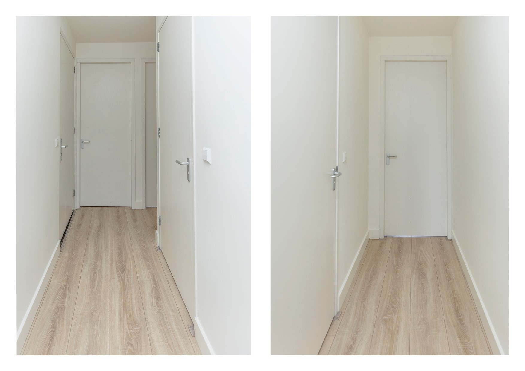 Entree tot ruime overloop die toegang biedt tot de woonkamer met open keuken, twee slaapkamers en badkamer.