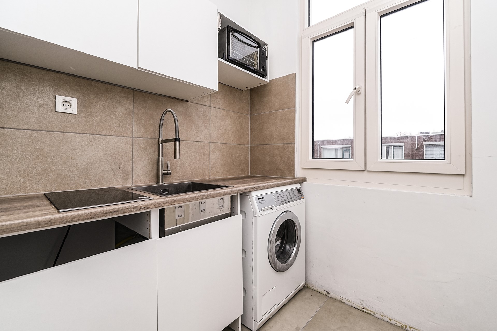 De keuken is aan de achterzijde van de woning gelegen en uitgevoerd in wit, met een houtlook aanrechtblad. De achterwand is netjes betegeld met grote, beige tegels. Vanuit de keuken heeft u toegang tot het achtergelegen balkon. Naast de keuken bevindt zich de (eerste) badkamer.