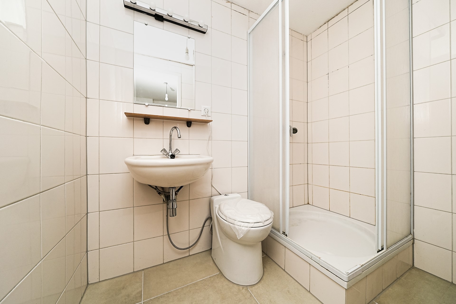 De badkamer is grotendeels betegeld met grijze vloertegels en witte wandtegels en is voorzien van een douchecabine, een wastafel en een toilet.
