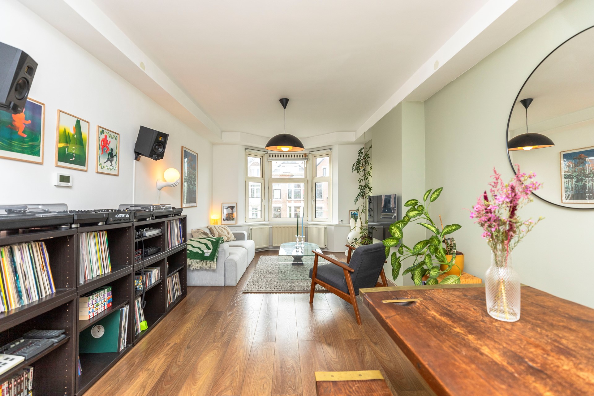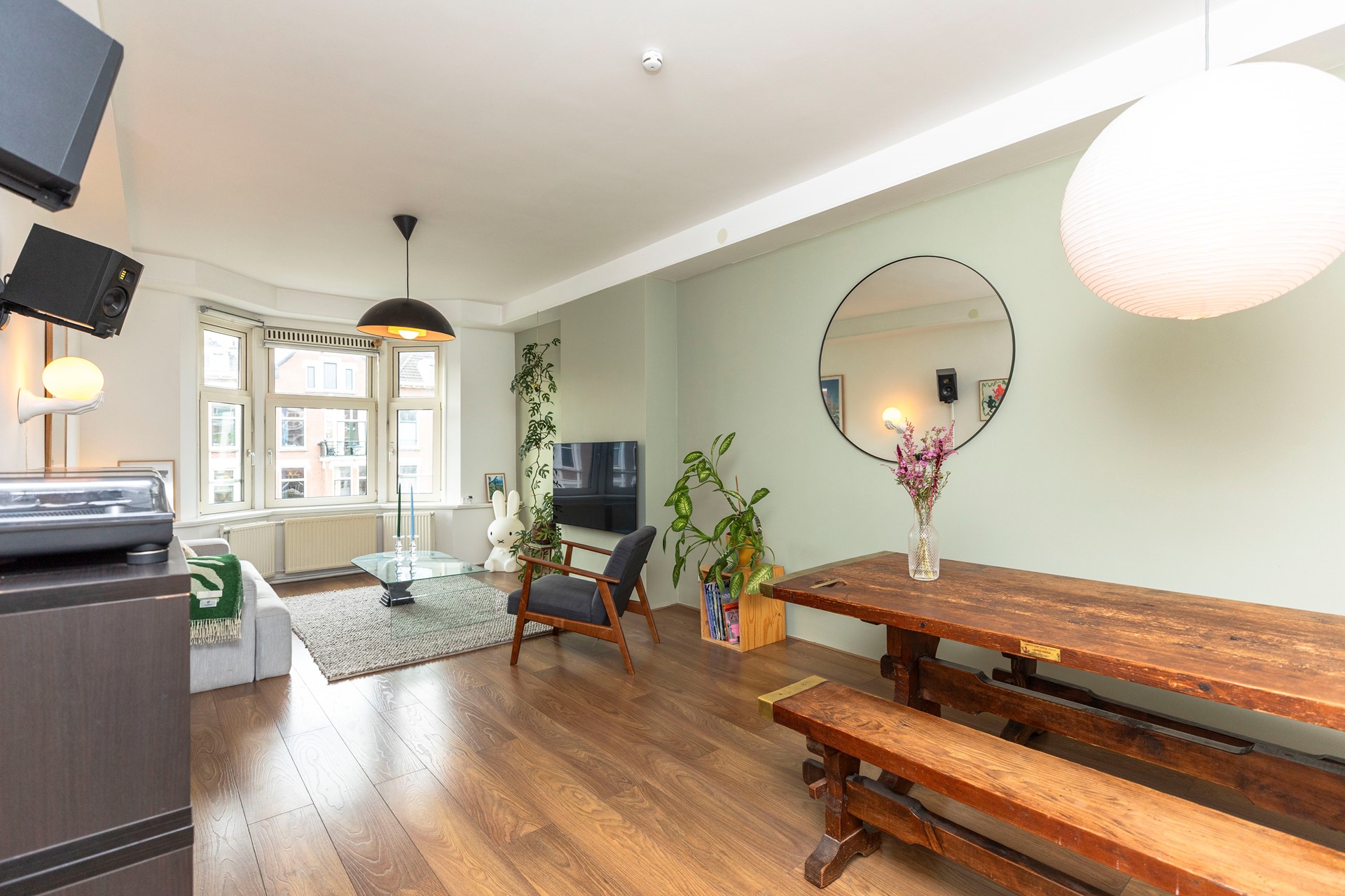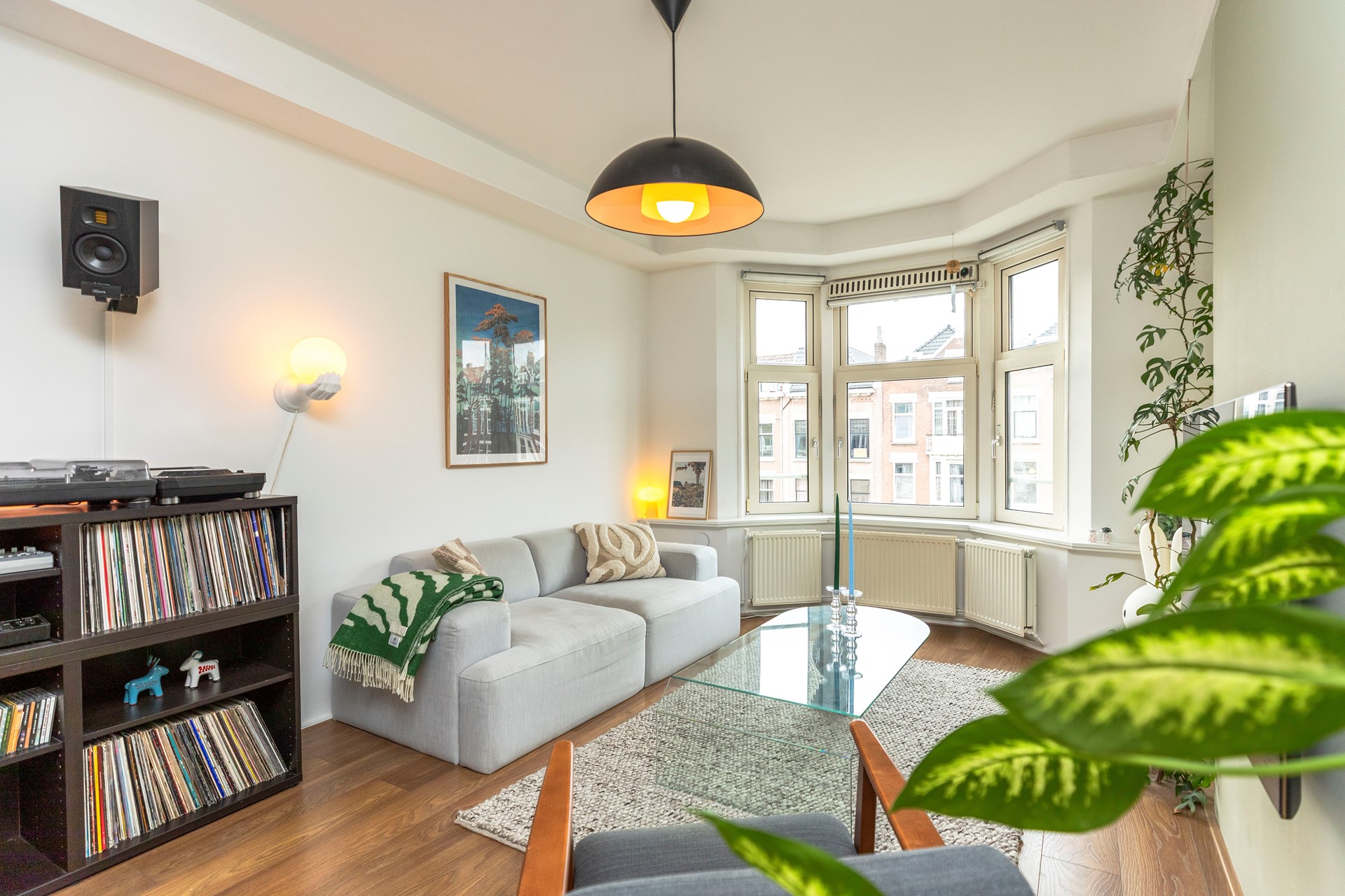 De woonkamer springt direct in het oog door de royale lichtinval. Grote ramen en een charmante erker zorgen voor een aangenaam ruimtelijk gevoel en maken het een heerlijke plek om te ontspannen of gasten te ontvangen. De wanden zijn strak gestukt en de ruimte is afgewerkt met een moderne, onderhoudsvriendelijke laminaatvloer die een warme sfeer uitstraalt.