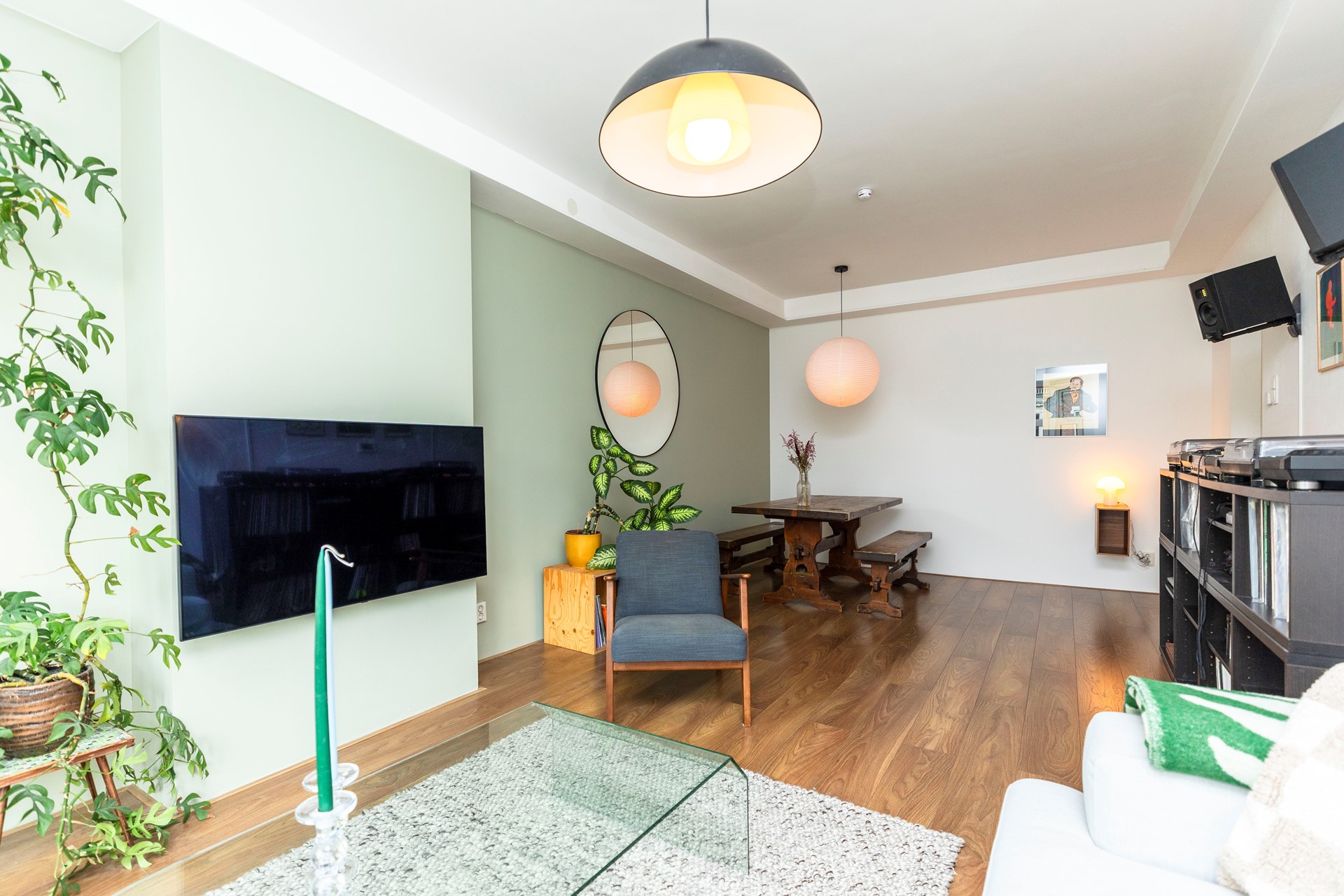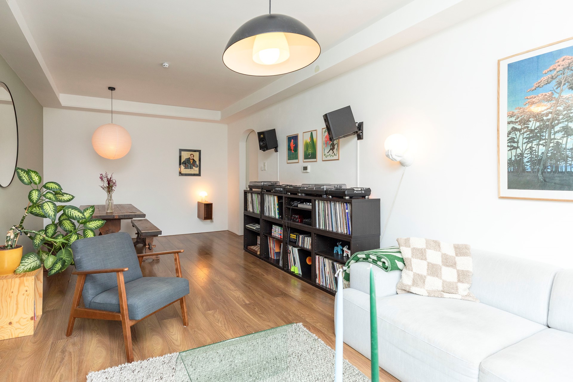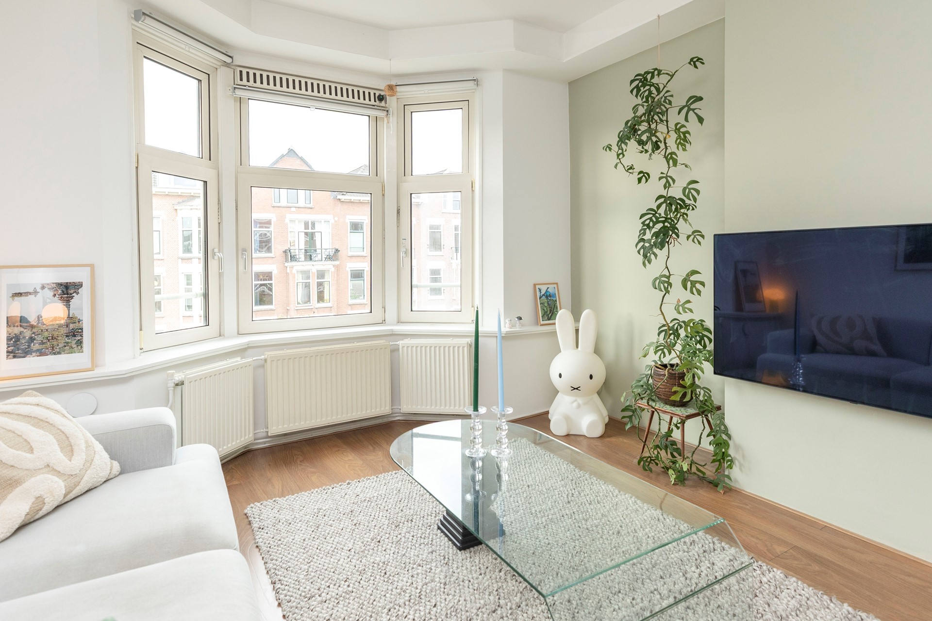 De woonkamer springt direct in het oog door de royale lichtinval. Grote ramen en een charmante erker zorgen voor een aangenaam ruimtelijk gevoel en maken het een heerlijke plek om te ontspannen of gasten te ontvangen. De wanden zijn strak gestukt en de ruimte is afgewerkt met een moderne, onderhoudsvriendelijke laminaatvloer die een warme sfeer uitstraalt.