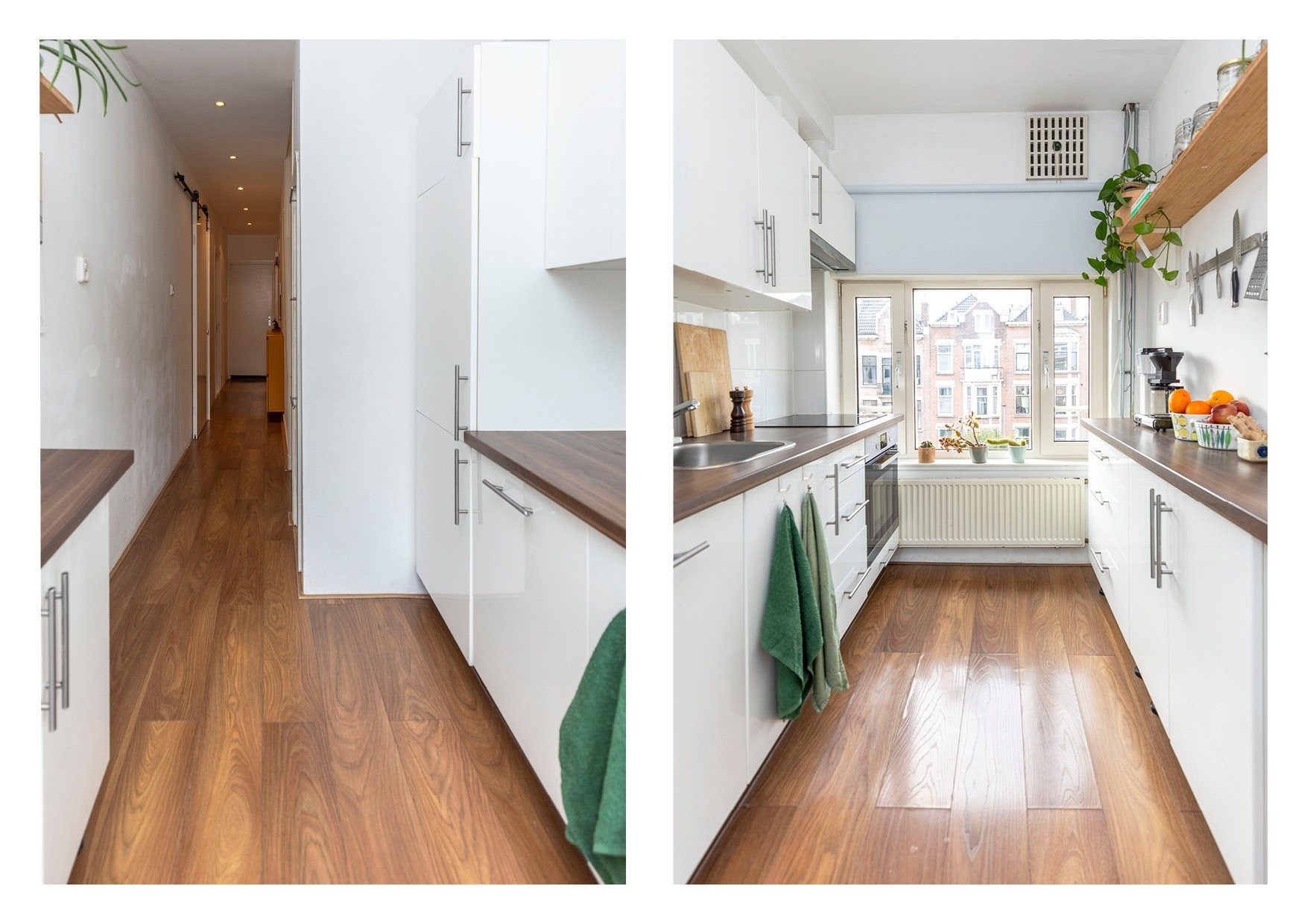 De keuken bevindt zich aan de voorzijde van de woning. Deze is uitgevoerd in een tijdloze witte kleurstelling met een stijlvol bruin werkblad.