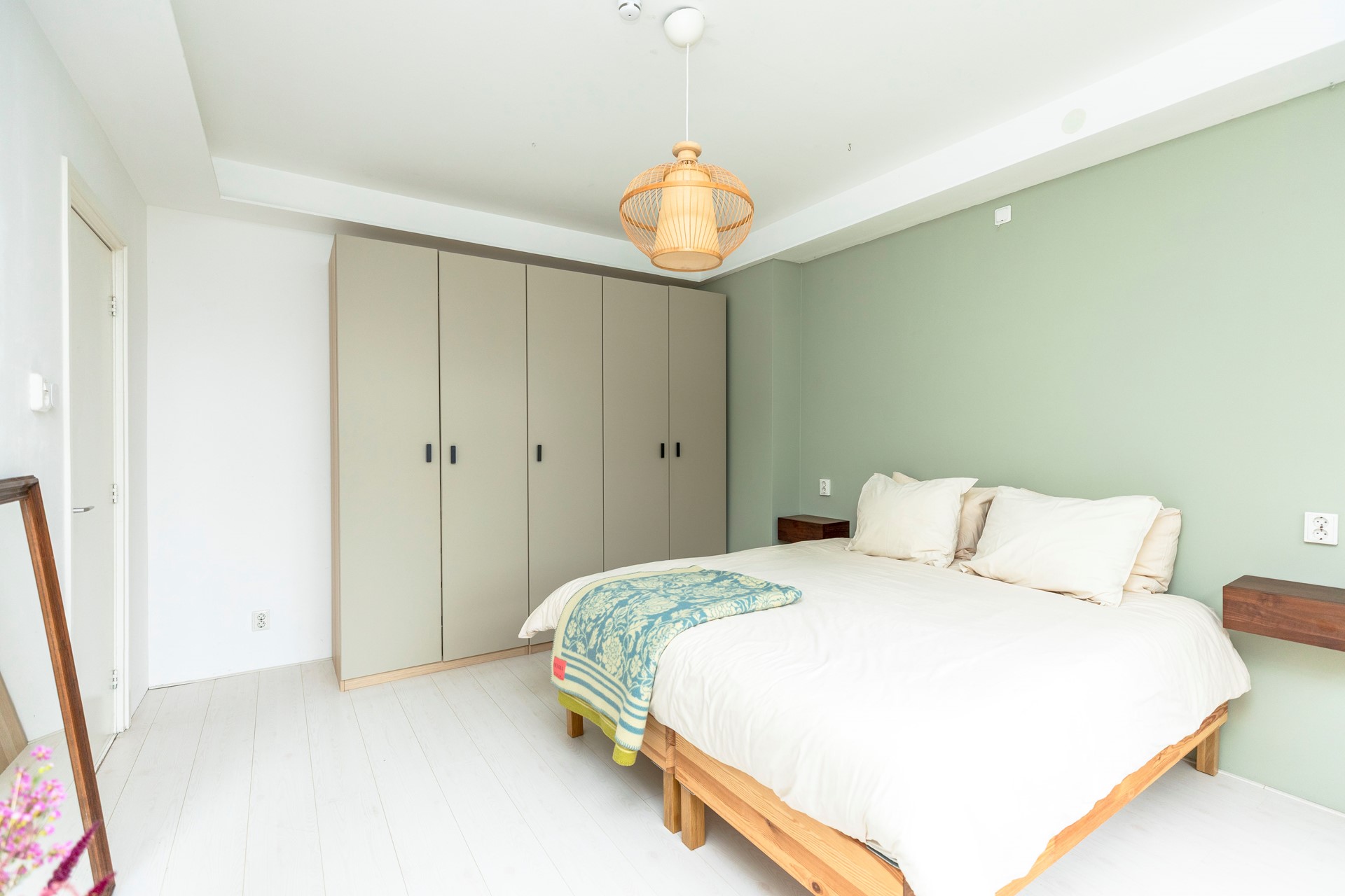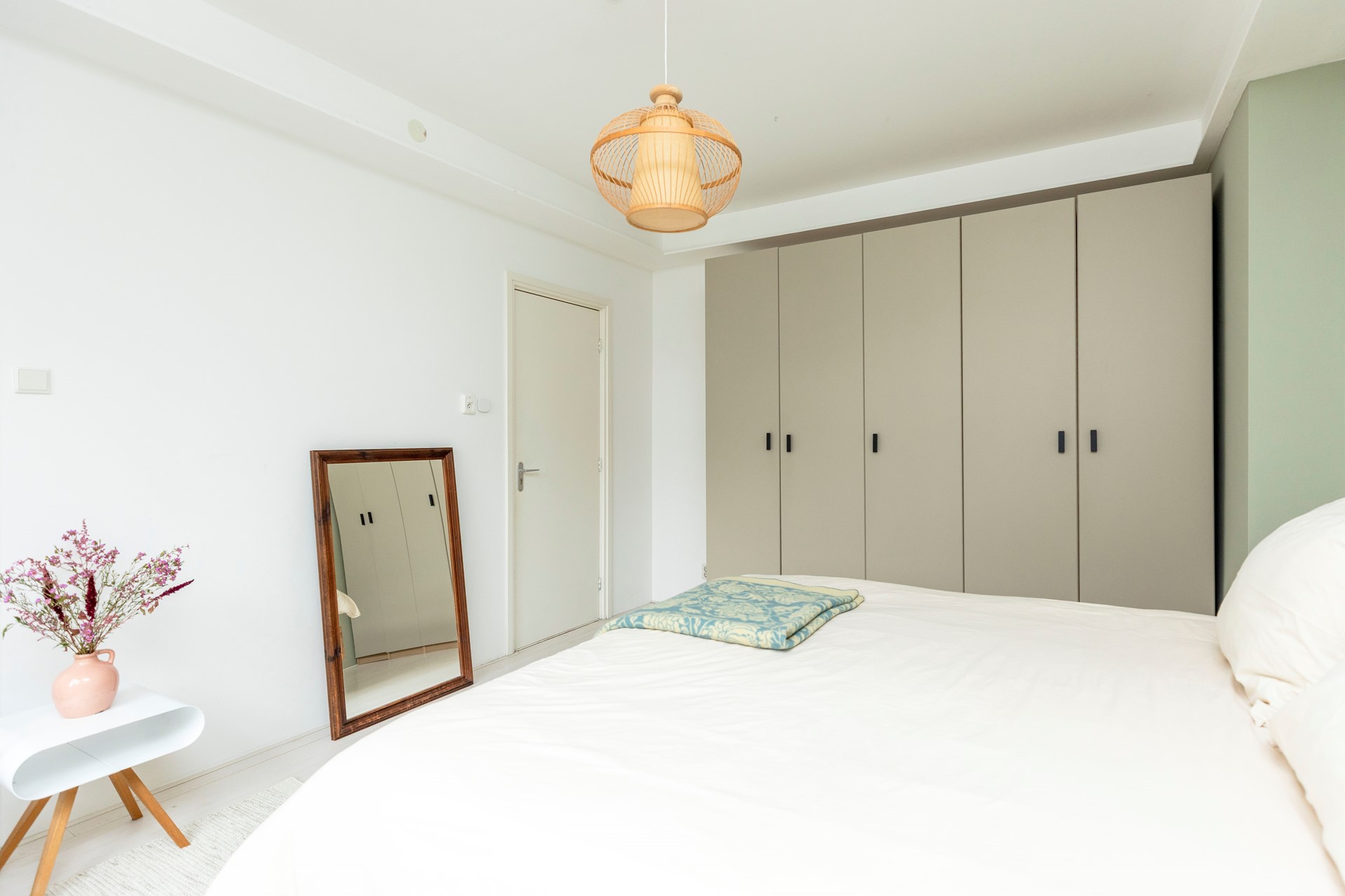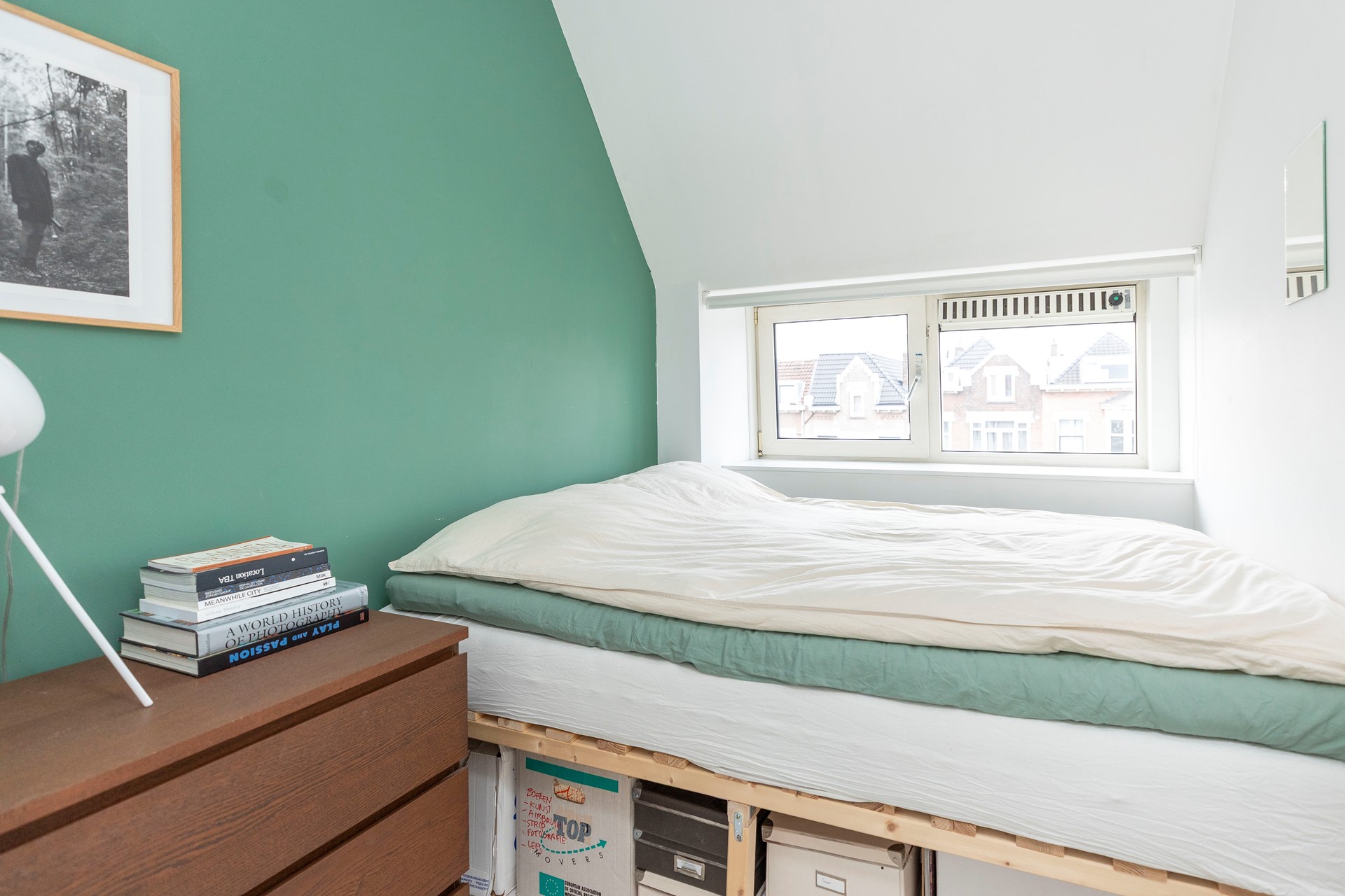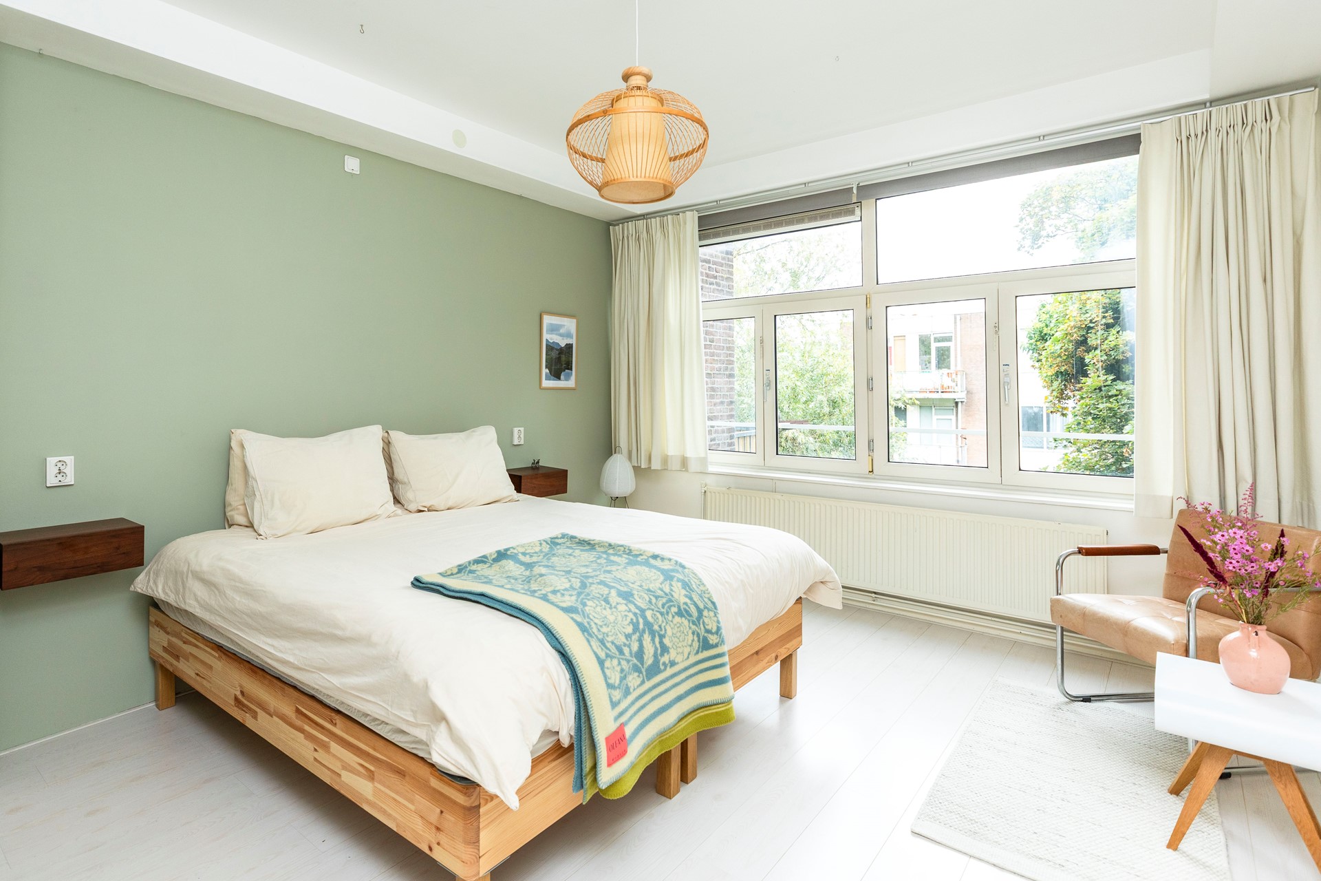 De slaapkamer is aan de achterzijde gelegen en biedt rust en privacy. Vanuit de kamer kijkt u uit over het groen, wat een bijzonder aangenaam uitzicht geeft. De kamer is netjes afgewerkt en groot genoeg voor een tweepersoonsbed en een royale kledingkast.