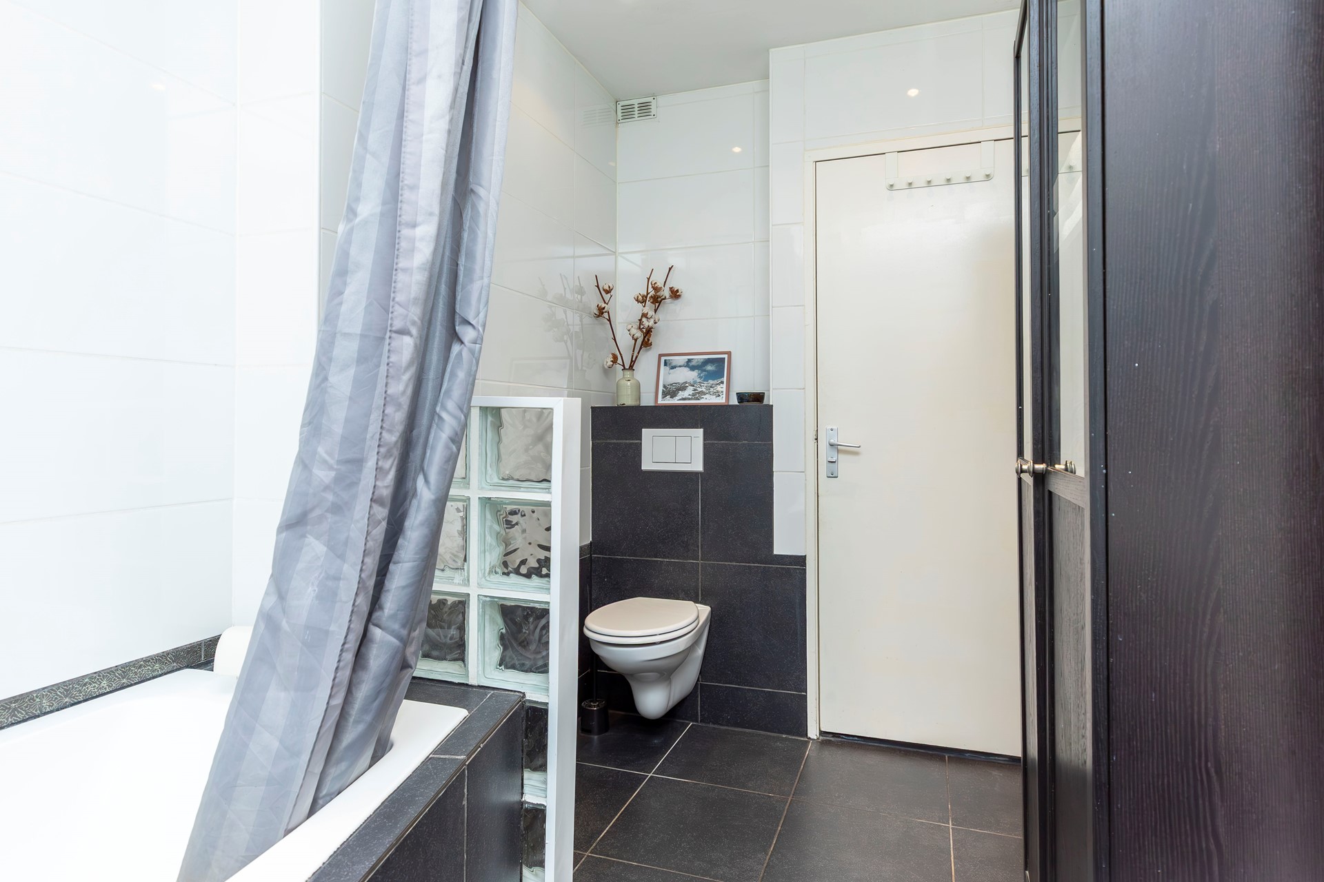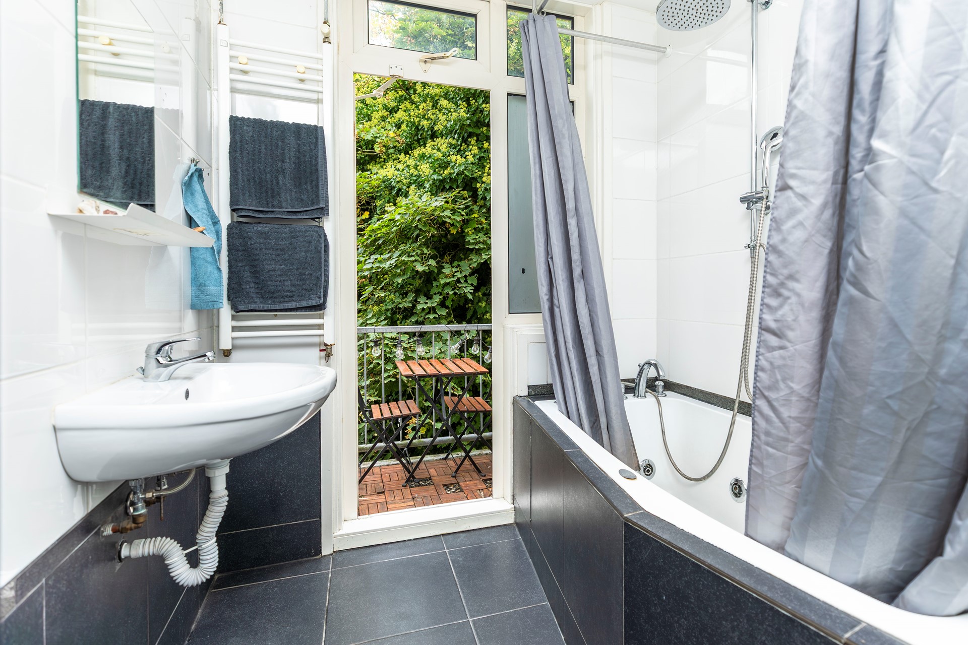 De badkamer bevindt zich eveneens aan de achterzijde en biedt toegang tot het balkon. Deze ruimte is praktisch en compleet ingericht met een ligbad voorzien van doucheopstelling, wastafel en toilet.