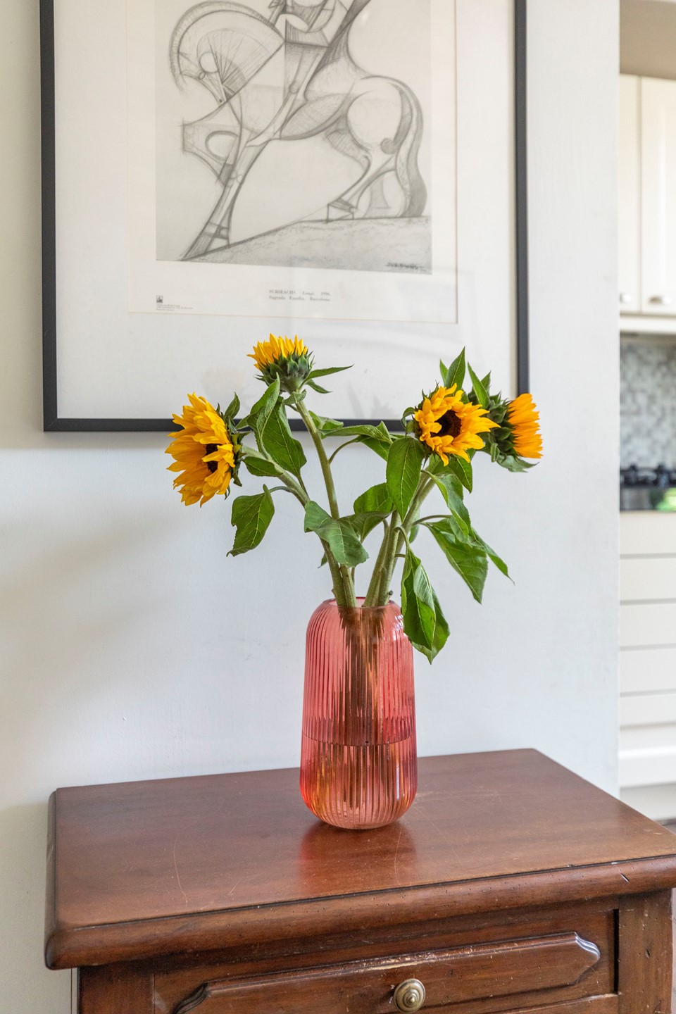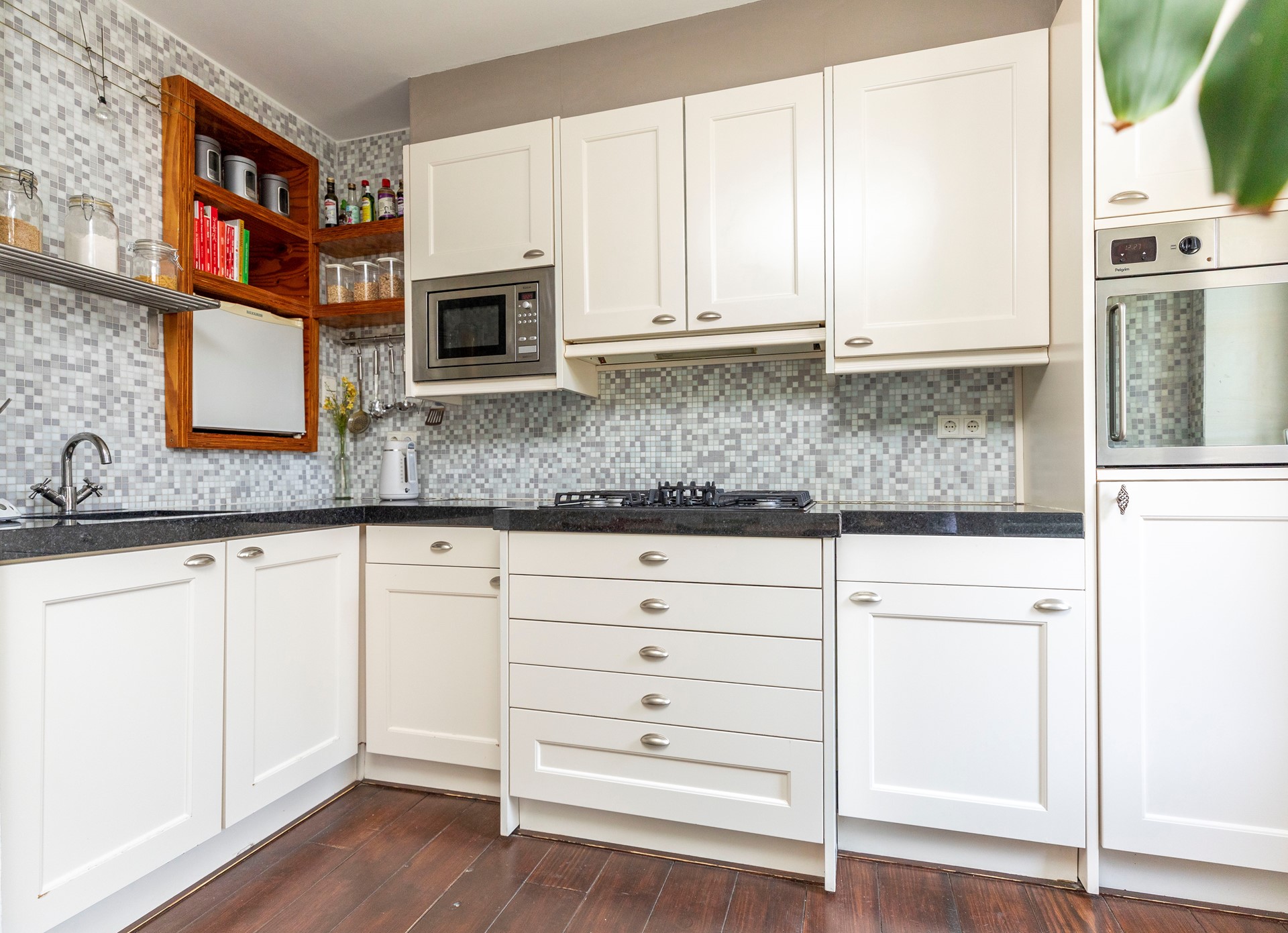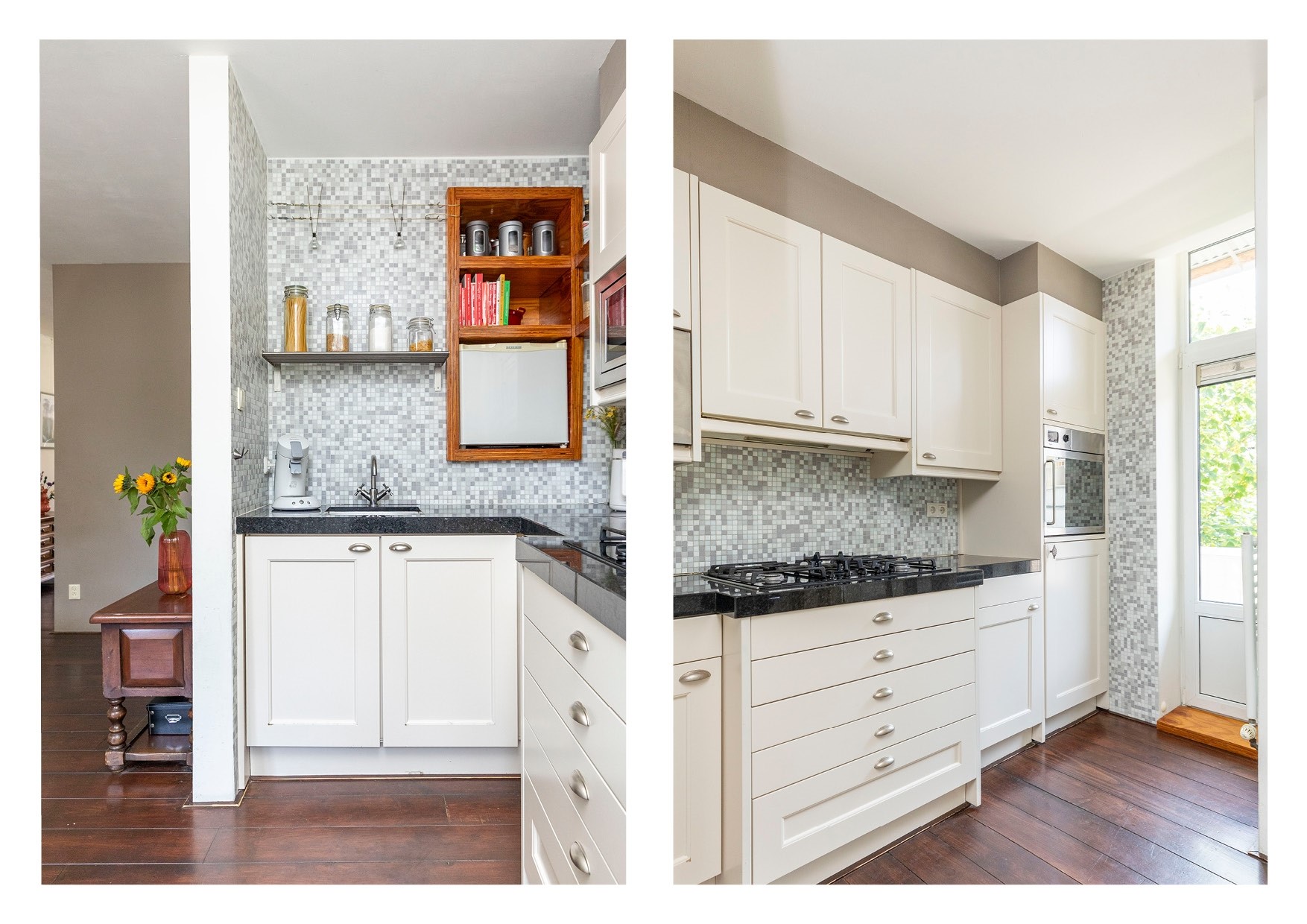 De keuken is open en beschikt over een hoekopstelling en lichte kasten met een donker natuurstenen aanrechtblad. Er is een 5-pitsgasfornuis met wokbrander, een afzuigkap, oven, magnetron, koelkast, losse vriezer en een spoelbak met mengkraan. De kasten bieden voldoende opbergruimte en er is een leuke nis voor het neerzetten van gezellige keukenspullen en kookboeken.