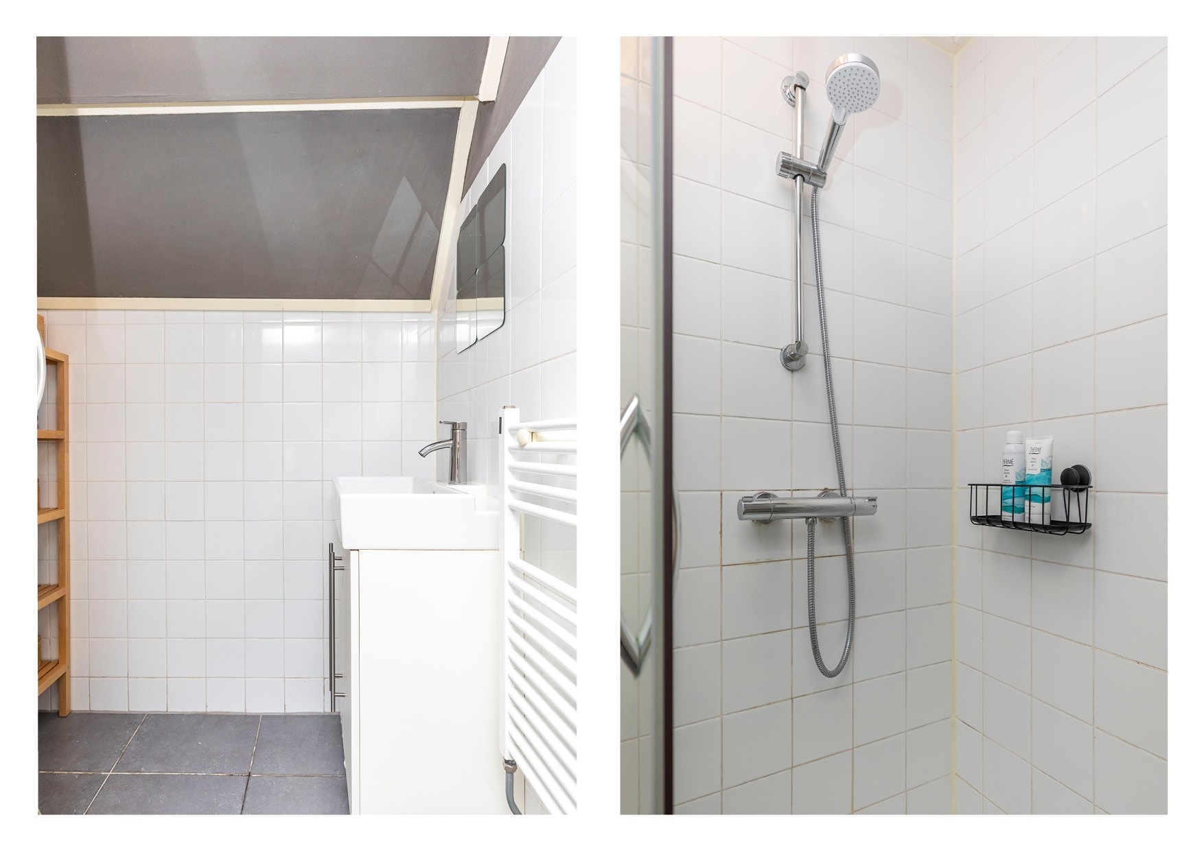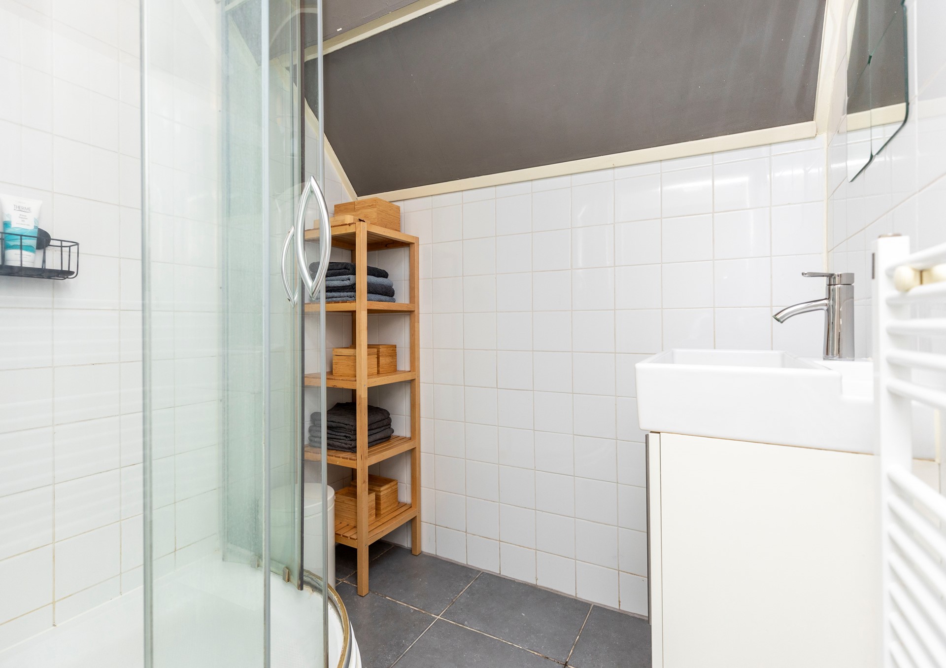 De badkamer beschikt over een douche met thermostaatkraan en handdouche, een wastafel met spiegel en meubel en een handdoekenradiator. De vloer is betegeld in het lichtgrijs en de wanden zijn grotendeels betegeld met witte tegels.