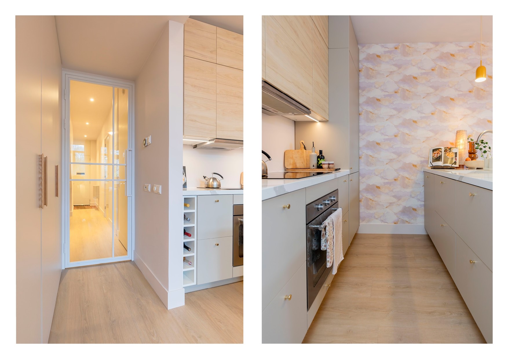 De open keuken is een echte eyecatcher en van alle gemakken voorzien. De keuken beschikt over een spoeleiland en een rechte opstelling met inbouwoven, inductiekookplaat, koelkast, vriezer en vaatwasser. De combinatie van beige keukenkasten, een marmerlook werkblad en houtlook bovenkasten zorgt voor een moderne en stijlvolle uitstraling.