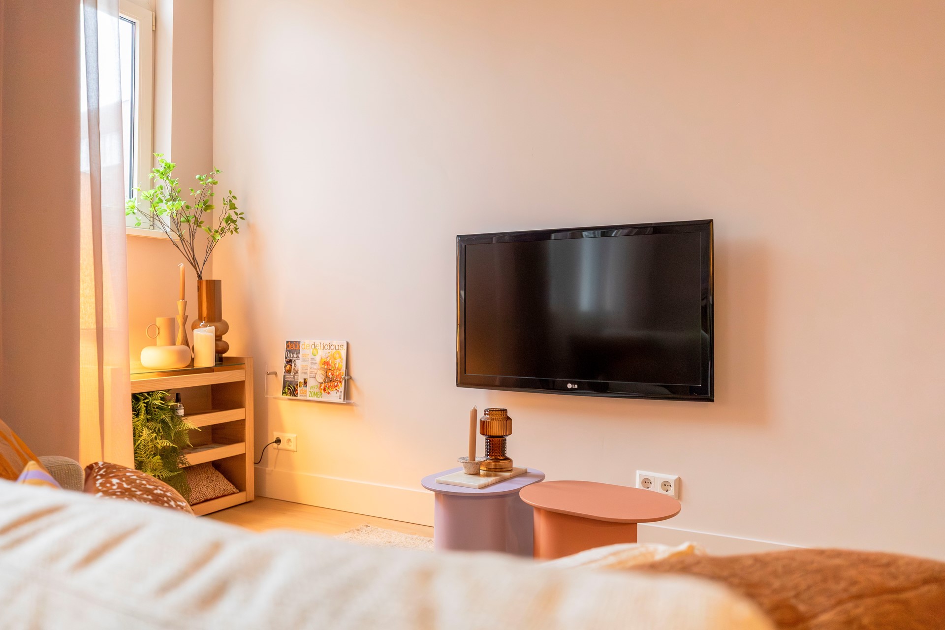 Bij binnenkomst in de woonkamer valt direct de hoogwaardige afwerking op: strak gestucte wanden en plafonds en een fraaie eikenhoutlook vloer die door de gehele woning is doorgelegd. De woonkamer beschikt over praktische inbouwkasten en voelt licht, ruim en sfeervol aan.
